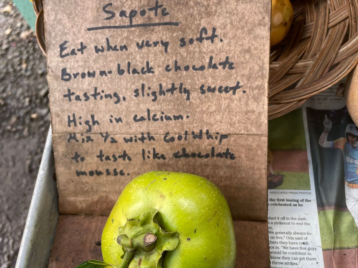 果樹園散策中も説明を聞きながら(果樹名を覚えているかどうかは別な話)沢山の種類の果物を試食できたし、最後にテーブルに座って更に果物がこれでもかと言うくらい試食できもうお腹いっぱいで食べきれませんでした。残りはお持ち帰り可です。今回食べた中で一番印象的な果物はブラックサポテ(柿の一種)でした。収穫してから真っ黒になるまで熟成させて食べます。味はチョコレートムースの様、クリームをかけて食べるのが美味しいと思いました。