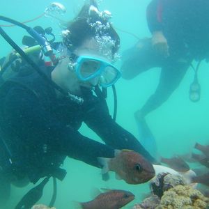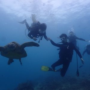 初めてのダイビングで少し不安でしたが、インストラクターさんが明るく気さくに指導してくださったのでとても楽しめました!ダイビング中に3〜4匹のウミガメと会ったのですが全然逃げる様子がなく、すぐ隣まで行って一緒に何枚も写真を撮ってもらいました!1ダイブめでは砂が巻き上がっていて少し見通しが良くなかったのですが、別のポイントに移動した2ダイブめでは潜った瞬間に15メートルほど下の海底が見えるほど見通しが良く、お魚がたくさんいて感動しました!事務所で1ドルで船酔い止めの薬がのめるのでおすすめします!