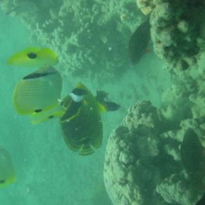 他のグループが潜っている間、そこで何十分も待っている。海から上がったらタンクに入っている水で汐を流す・・なんともサバイバル状態。海の中ももう少し水のきれいな所がよかった。魚を集めるのにパンを撒きすぎでせっかく撮ってくれた写真の画面が汚かった。この場所が良くないんじゃないのかと思いました。