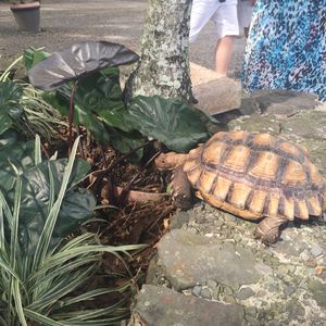 味付のマカダミアナッツが売っていて、試食もできる。庭に亀がいた。