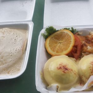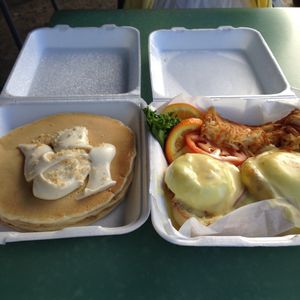 事前に車中でグループ毎に注文を取りますが、その時に人気メニューを教えてくれましたので、どれにしたら良いか、迷わずに食べたいものをお願いできました。到着すると電話注文しておいてくれたものが直ぐに手渡され、近くのフード・コートでコーヒーや紅茶を買っていただきました。私達は、エッグベネディクトとマカダミアナッツ・パンケーキをシェアしました。手作りするときは、「何処のパンケーキ粉が美味しい」とか「パンケーキ・ソースはこうやって作る」とか「ポーチドエッグでなくても半熟目玉焼きでも美味しい」とか、たくさんのことを教えてもらいました。そして記念写真も撮っていただきました。
