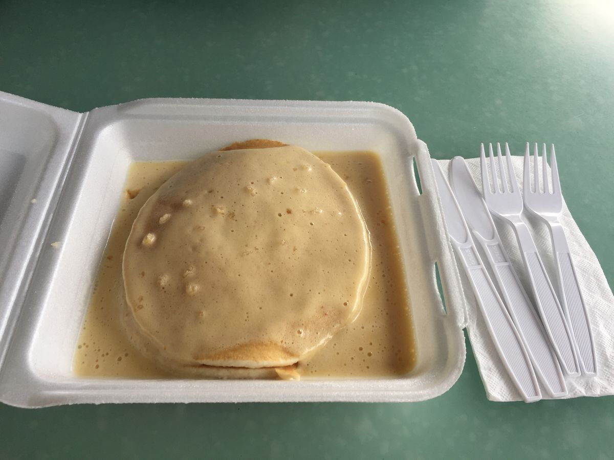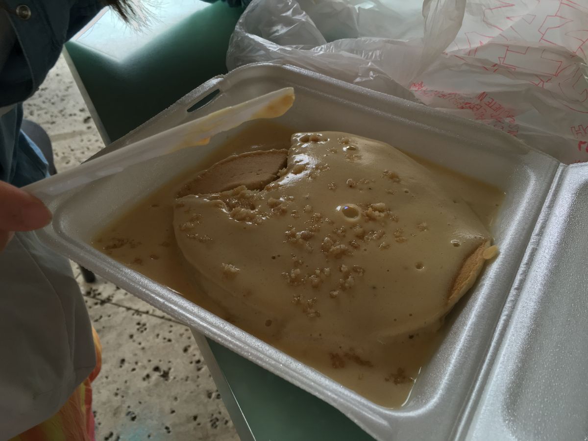 1️⃣朝ごはんはいきなりパンケーキ、ソースがオリジナルでうまい!