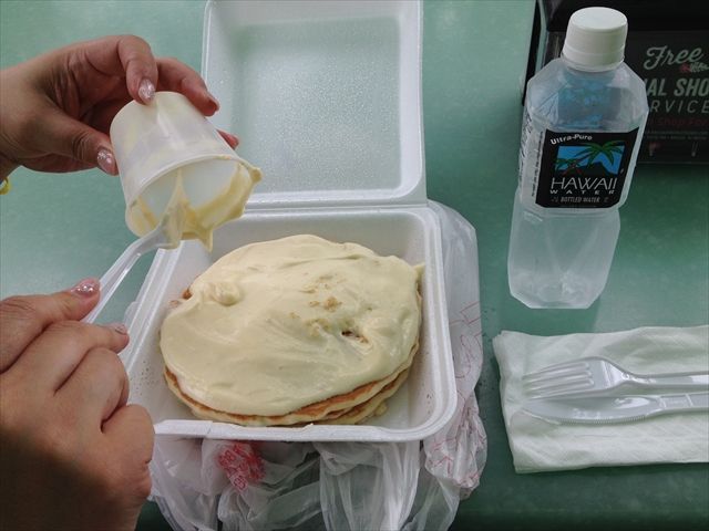 まず朝からカイルア移動しテイクアウトしたブーツアンドキモズのパンケーキへ。移動途中でガイドがお店に連絡し注文しておいてくれるので到着後受け取りがすぐです!!