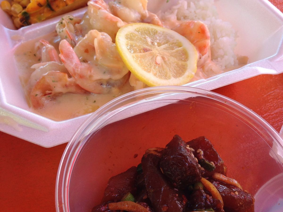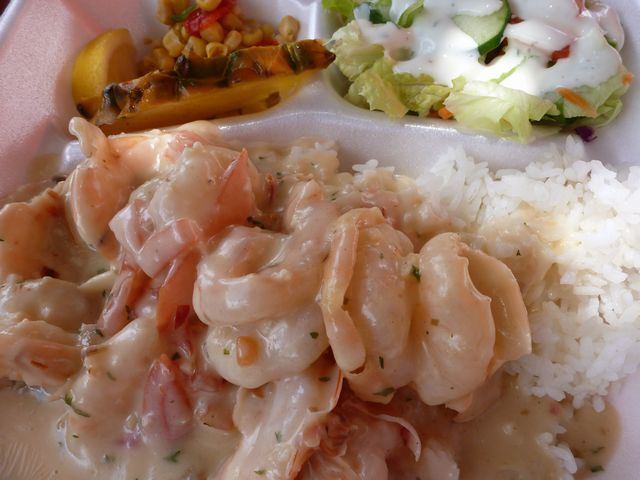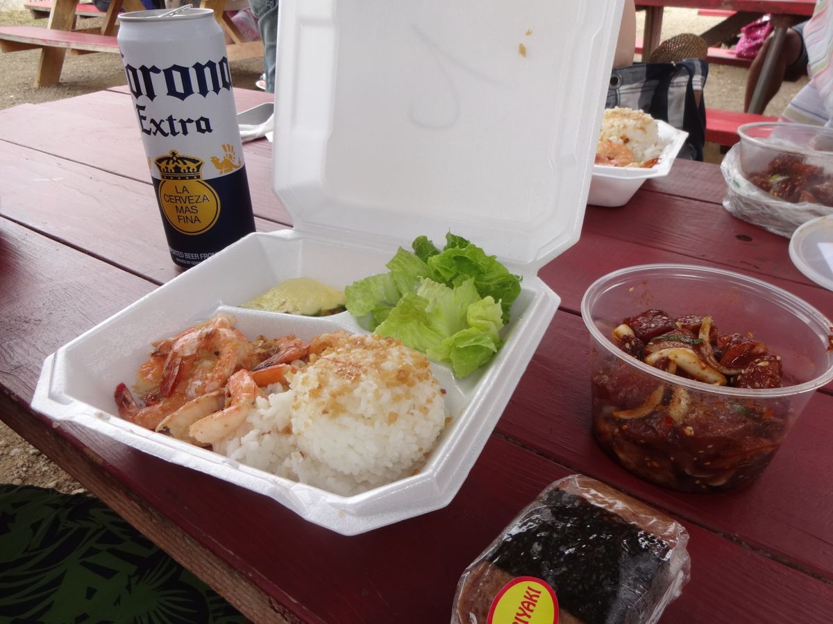 アヒポキはTAKEOUTしガーリックシュリンプの屋台?で一緒に食べることになります。