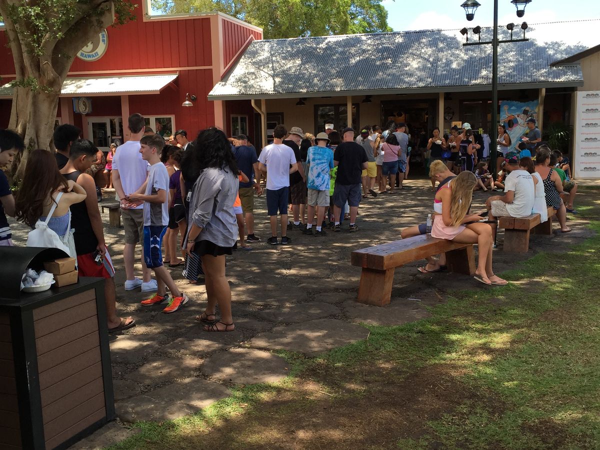 デザートにモヤモヤさまーすでおなじみのマツモトシェーブアイスを。超行列〜。ただのかき氷なんだけど、シロップが意外と美味しかった。ハレイワ散策は1時間なのでマツモトシェーブアイスに並んだらあまり他は見れないですね。