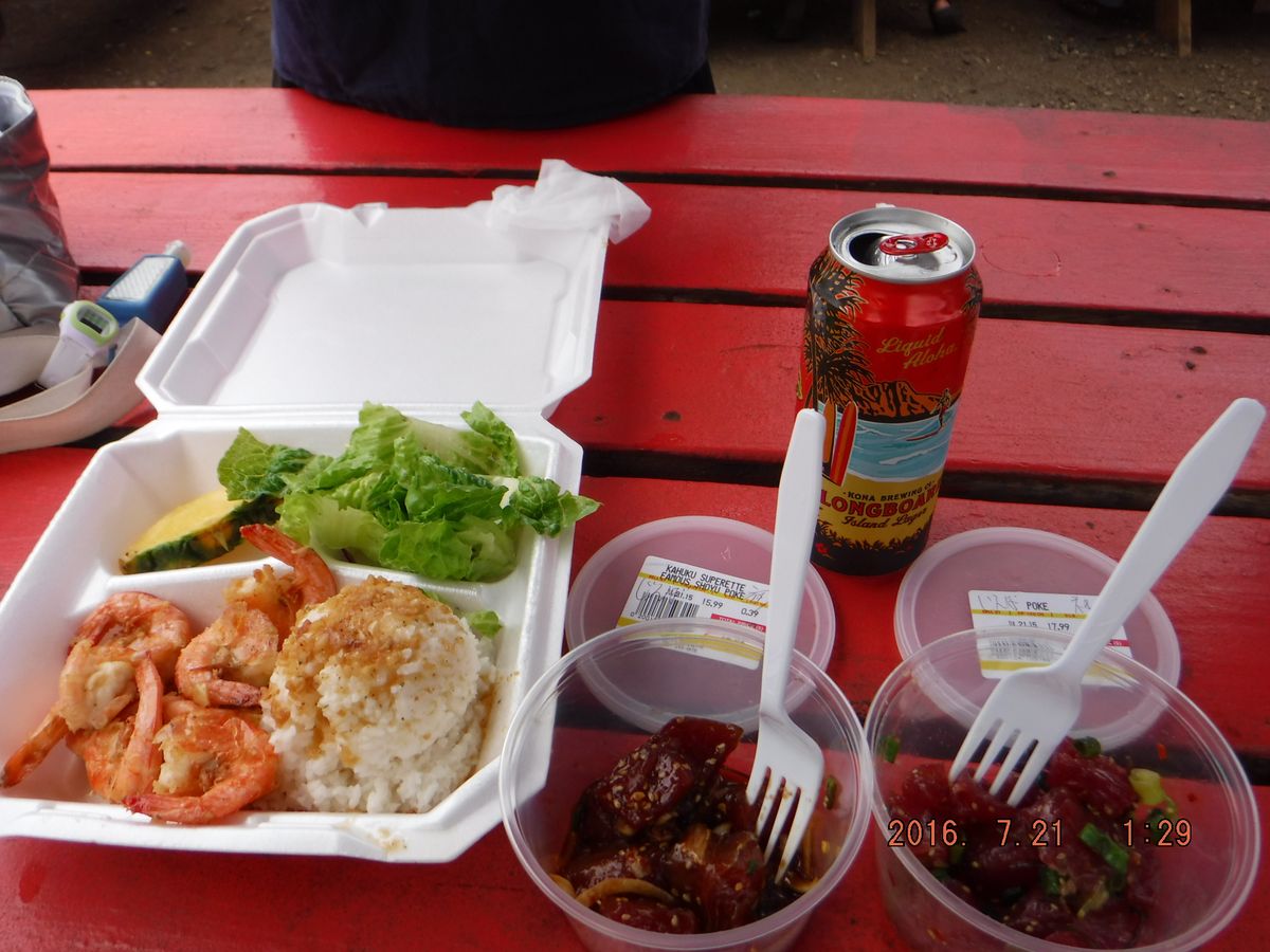 ハレイワに入り、昼食のガーリックシュリンプ!色んなお店があるみたいだけど、有名処のマッキーに。隣にセブンイレブンがある!からビール飲みたい人は年齢証明持ってた方がイイかも。