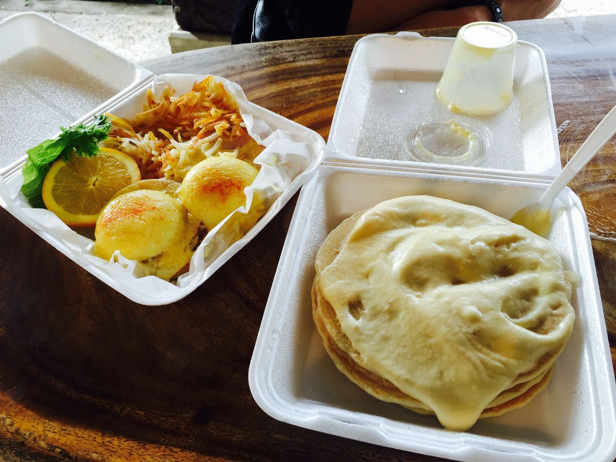 私達は、EGGS BENEDICTとKimo’s Famous Macadamia Nuts Sauce on His Onolicious Pancakes