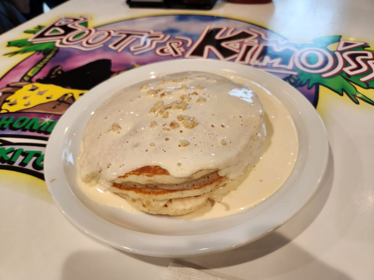 まずブーツ&キモスでの名物マカデミアナッツパンケーキの朝食。