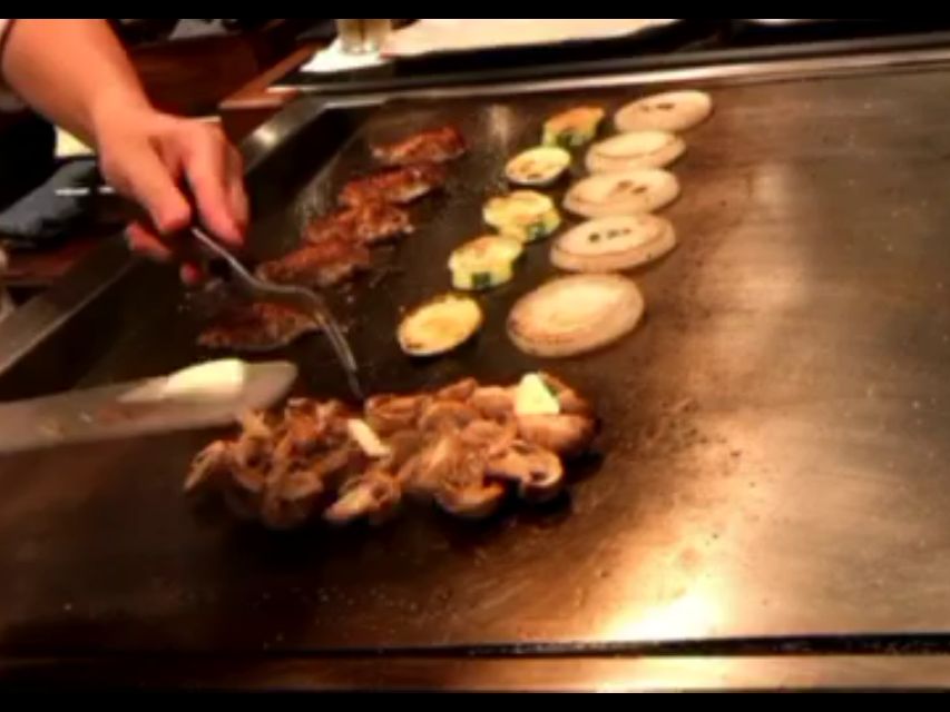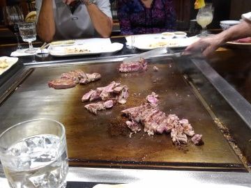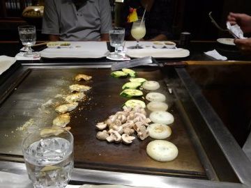 鉄板の周りに6人席があり、シェフ一人が野菜・お肉・ガーリックライスを焼いて作ってくれます。私が案内された席は、ハワイ在住日系3世のご夫婦、オーストラリアのご夫婦と私と母の6人でした。シェフはハワイ在住の日本人で、時折日本語を混ぜて焼き方など説明してくれました。