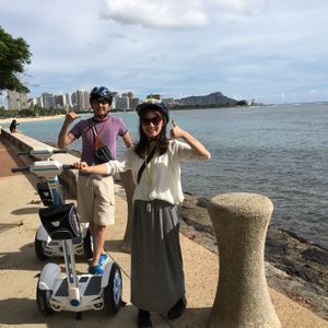 テレビなどで話題になったセグウェイの進化版エアーウィールに乗って、ハワイの街並みや海岸の景色を満喫しました。バランスをとるのが難しいだろうと上手に乗ることができるかどうか不安もあったのですが、はじめにマンツーマンで丁寧に分かりやすく乗り方や止まり方、降り方を教えていただけて、安心して街中を走ることができました。走行中もスタッフの方がすぐそばにいて、気を付けたらいい場所など細かくアドバイスしてくださるのが有り難かったです。坂道やでこぼこ道もエアーウィールが自動的にバランスをとってくれ、行きたい方向に気持ちよく進むのが面白かったです。また、途中で休憩したり、乗っているところを撮ってもらったりと、私たちのペースに合わせて進んでくださるので、ほとんど疲れず、あっという間の時間でした。スタッフの方々にハワイのことについていろいろと質問したり、ハワイの豆知識や情報を教えてもらったりできたことも楽しかったです。最後になってしまいましたが、ホテルまでの送迎も親切な対応で、初めから終わりまで安心して参加できました。また機会があったら、ぜひ乗ってみたいと思います!