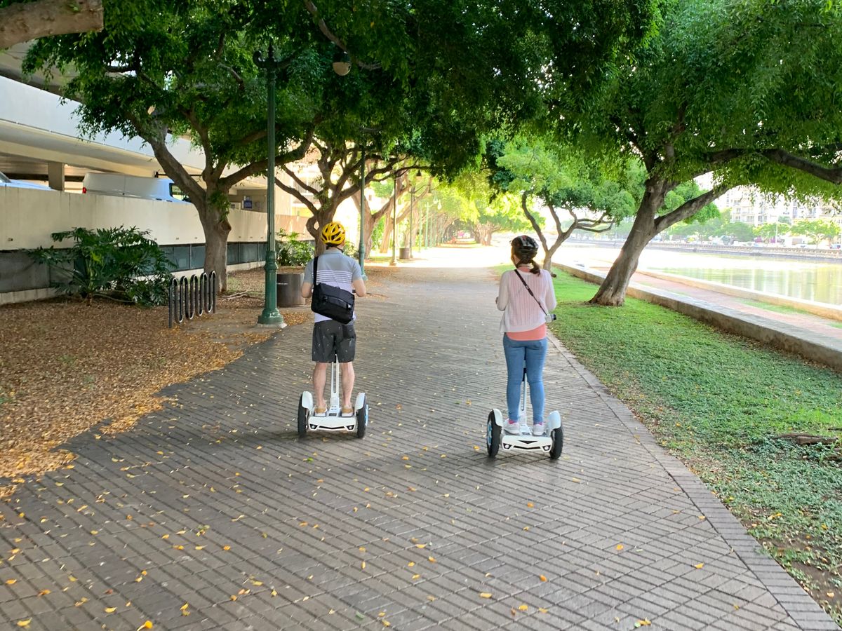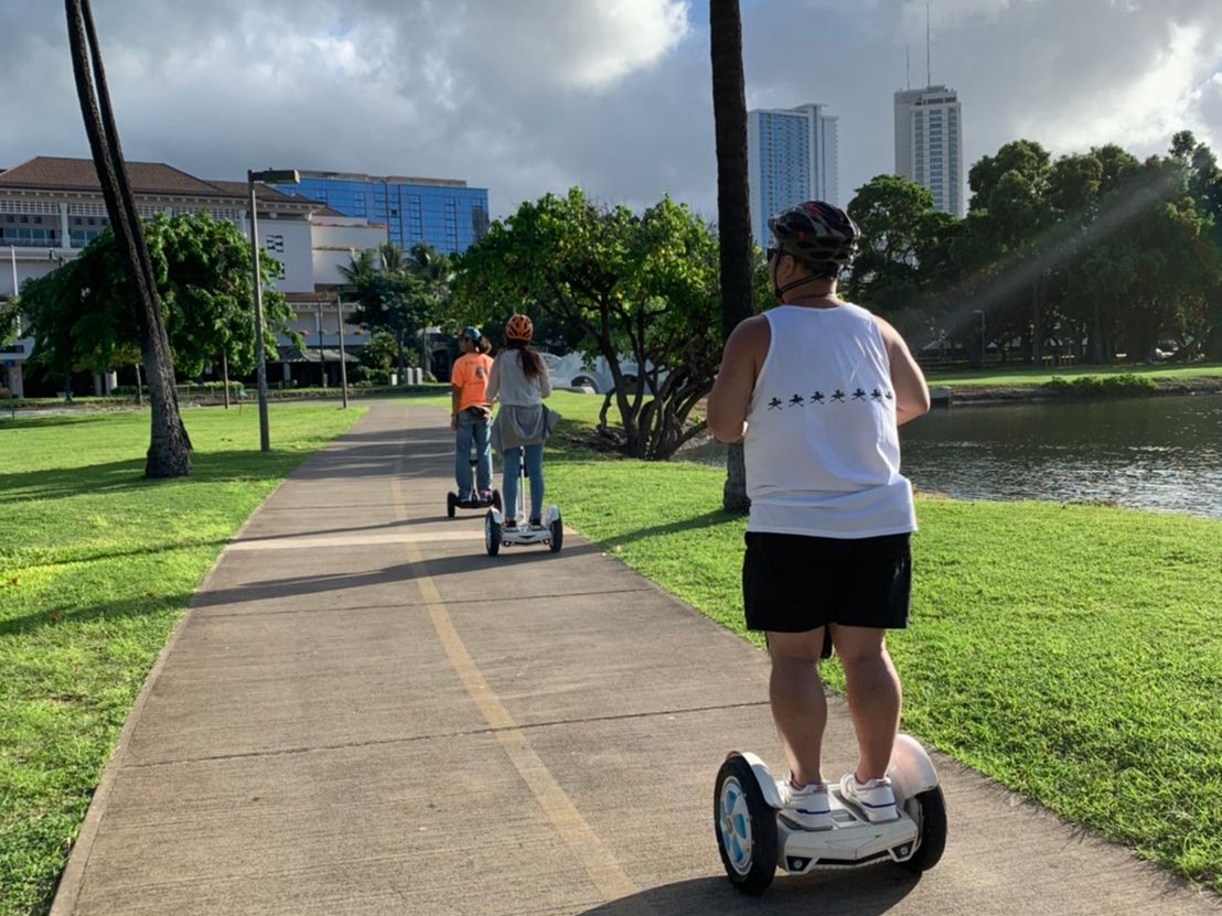 ワイキキ地区のホテルから直接送迎いただき、大きな公園で10分ほどのレクチャーを受けたあと、早速街中へエアウィールで移動しました。