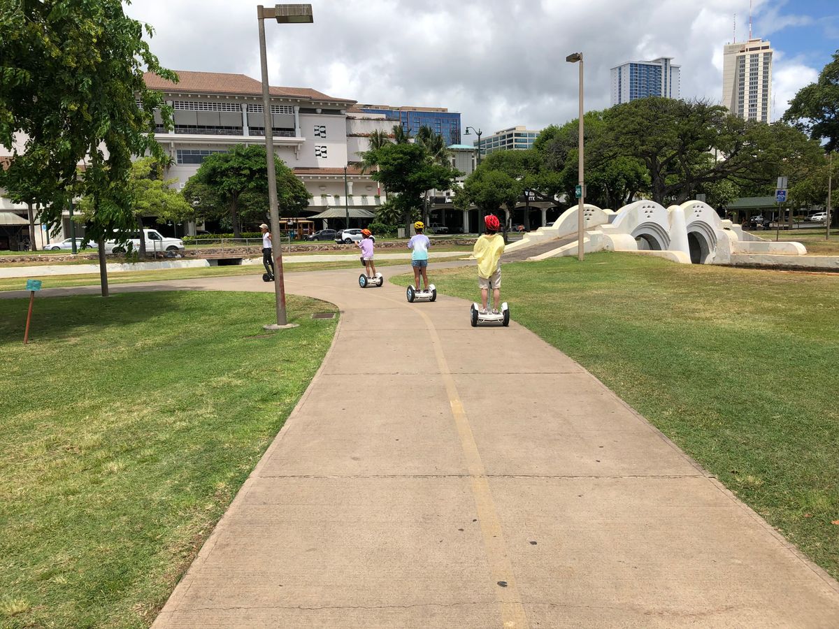 3人家族に1人インストラクターさんがついてくれてまずは練習。そこからアラモアナ→カカアコ地区→アラモアナビーチをまわりました。風と景色ともう楽しく仕方ない!カカアコで用意してくれたランチ(アサイーボウル、ホットドッグ)も美味しかった!