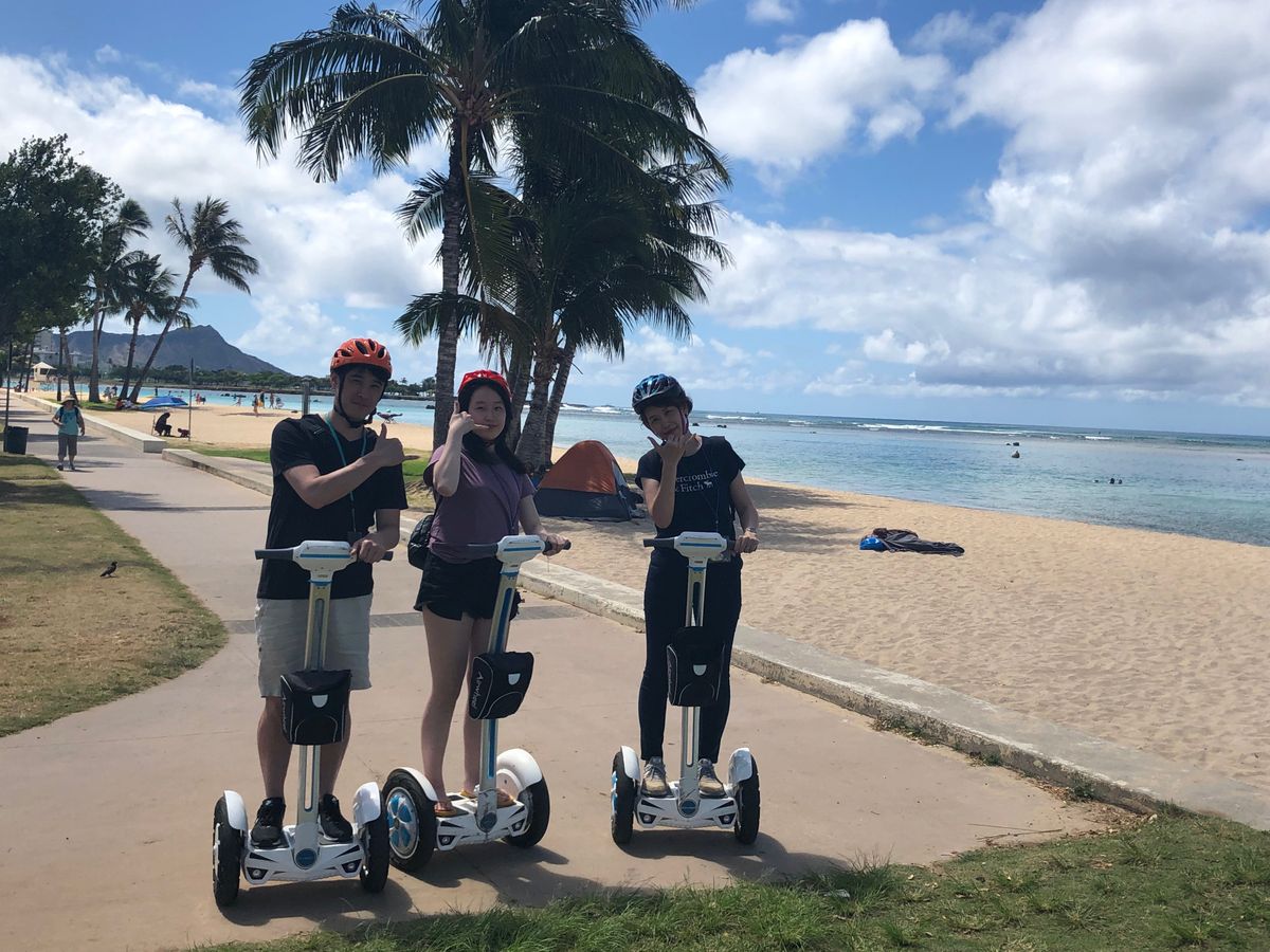 エアウィールはセグウェーの小さいもので、初心者には扱いやすいもののようです。しかし、とっても楽しくて街中を移動するにはちょうどいいと思います。昼のコースでカカアコまでツアーできて気持ちよかったです。頼んでいたホットドックも今までで一番おいしいものでした。オバマさんも食べに来ているそうです。ツアーの隊列前後にスタッフもついてくれて安全、おすすめです。次回はカカアコスーパー、買い物めぐりツアーなどを計画お願いします。
