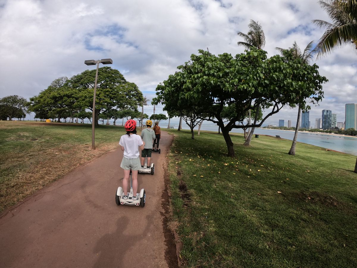 アラモアナパークをぐるっと周るコースで、走りやすい道で、なんといっても景色、当たり前ですが青い空に青い海、緑も豊かで最高のローケーションでした。アラモアナの湾にはウミガメが来ているということで、最初見えなかったのですが、終わりの方に海面に現れてくれて、見ることができました。また、インストラクターの方が先頭に立ってアラモアナのガイドしてくれ、写真・ビデオ撮影もしてくれて家族揃ってのいい思い出を記録することができました。あっという間の1時間でしたが、最高の体験でした。