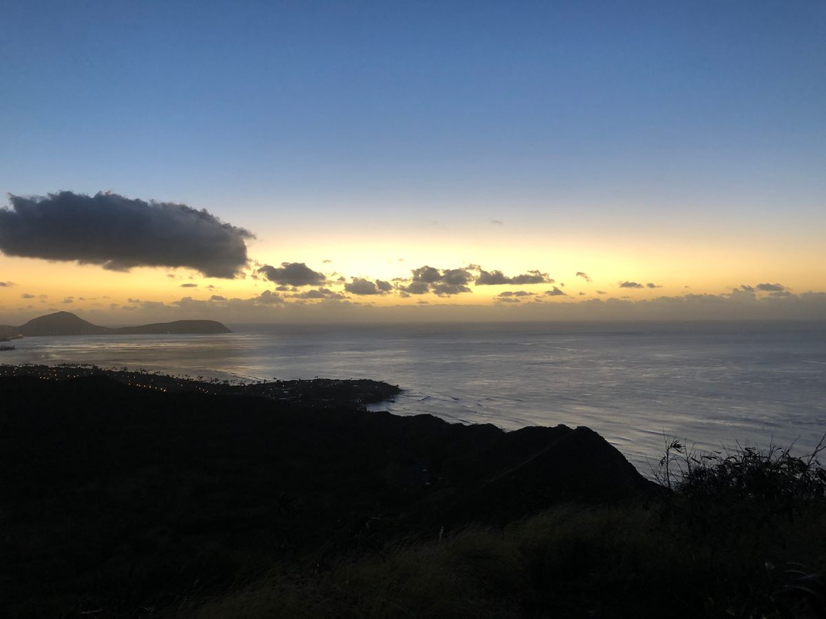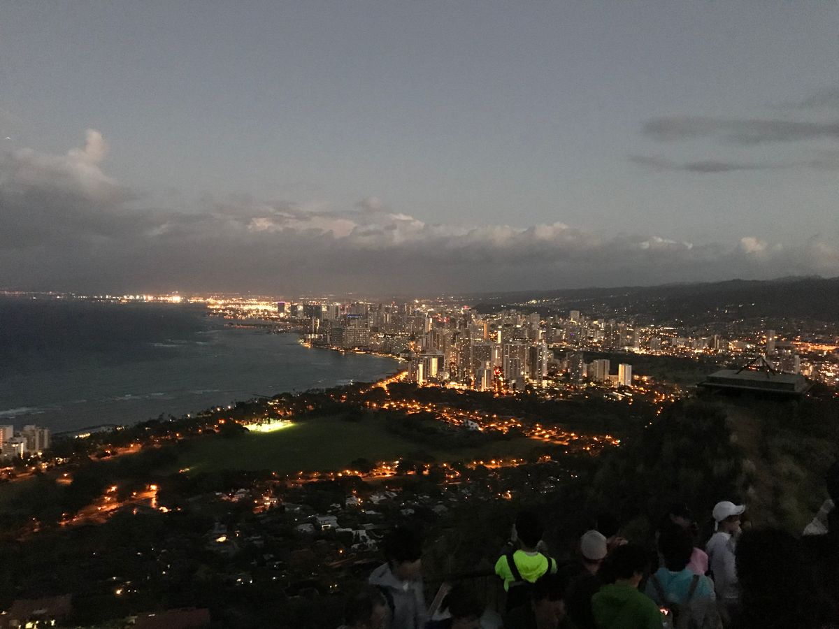 2/8に家族でこのツアーに申し込みしました。朝5時15分待ち合わせ。ホテルから、ピックアップ場所が近くて、五分程で到着。まだ真っ暗の中、麓までバスで。登り始めは、携帯の明かりが無いと、足元が見えないし、道は悪いし…絶対に、靴でないとダメ‼️何人かは、水溜りに足がとられて、はまっていましたが…かなりの人でなかなか前に進めない中なんとか登頂その日の日の出時間は、7:04分。寒い中待つが、お日様見えず…出発時間を事前にかなり何度も厳守‼️と言われており、泣く泣く下山の途に。途中、口コミに『下山の時に日の出が見れた』と言うのがあり、そのパターンか?と話していたら、やはり。でも寒かったけれど、ダイアモンドヘッドにも登れたし、日の出☀️も見れたので、よかったです。でもハワイだから、暑いだろうと甘く見てると、えらい目にあいます。必ず、上着とスニーカーは必要!私達は、ダイアモンドヘッド登頂だけのツアーでしたが、帰りには、IHopでモーニング☕️を食べれるように途中で降ろしてもらい、9時過ぎにはホテルへ帰り、一日、有意義に過ごせました。