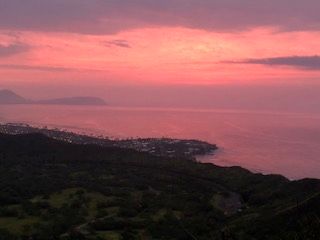 日の出前はもちろん暗い為、スマホの懐中電灯照らしながら歩きました。頂上に着いた時は夜景を、その後はきれいな朝焼けも見ることができ、参加して良かったです!
