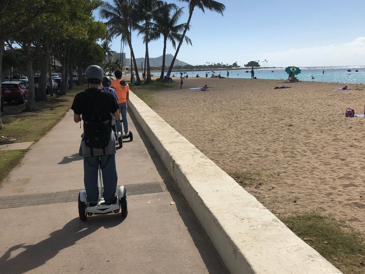 朝7時からのツアーで、説明と練習を約20分ぐらい受けた後、コンベンションセンター界隈からアラモアナビーチパークのコースだったのですが、早朝から結構ランニングやウォーキングをされてる方も多く、道が広いと良いのですが狭いとこのコンパクトなエアウィールの方が避け易いのかなと。途中で何箇所か撮影ポイントで休憩し、妻と二人だったのですが、先導員1名とカメラマン(?)1名の計4名でした。先導員の方は若いイケメンで、カメラマンはよく喋る陽気なおじちゃん(的な)でした。あ、カメラマンさんは後で写真を買わせるとかではなく、所持してたスマホを渡して、勝手に撮ってくれるタイプです。これがなかなかよかった。また、ほんの少し雨が降ったお陰で虹も見れる事が出来ました。早朝からすがすがしく良い運動が出来とても有意義な時間になり、はじめてでも90分はあっという間でした。次回も是非利用したいアクティビティです♪