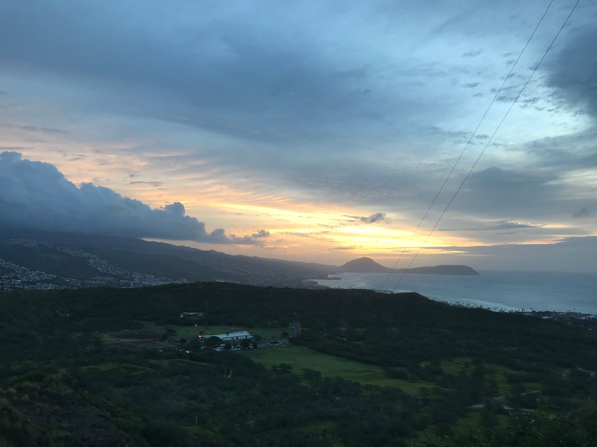 早朝暗いうちにダイヤモンドヘッドのふもとまで行き、暗いうちに登り始めます。携帯電話のライトを足元に照らしながら、、思ったより早く山頂まで上がれ、余裕を持って日の出を待てました。とても綺麗なシーンを見れて心が洗われるようで、、感激でした。登って良かった〜!