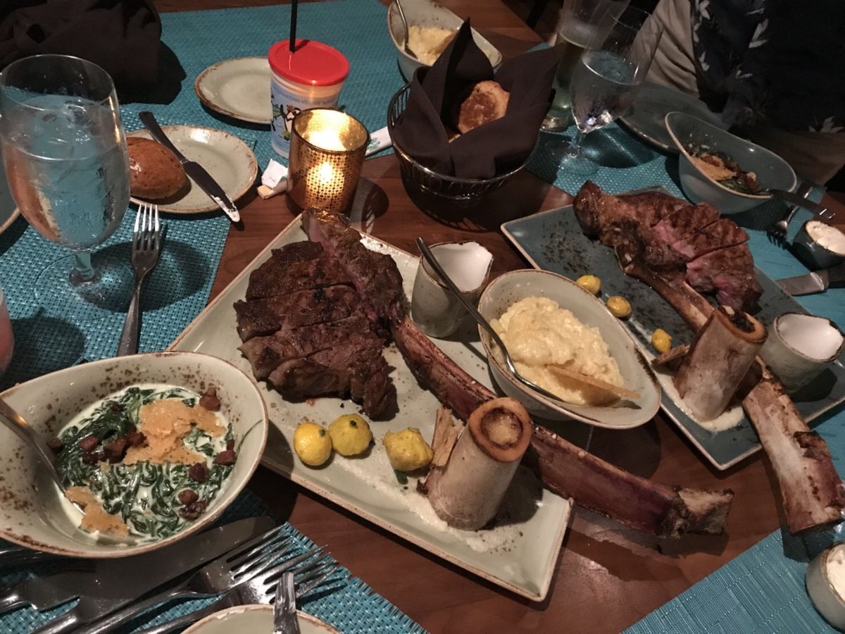 カニとロブスター、エビが盛られた皿の後、Tボーンステーキ。