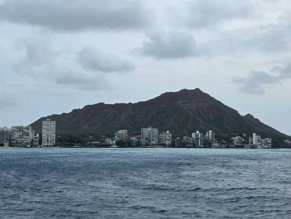 クジラは見ることができませんでしたが,ダイヤモンドヘッドはあらゆる角度から見ることができ,とても感動しました.まず,大きな船であるにも関わらず,その速さは想像の4倍ぐらい速かったです.そのため,船の屋上に登ると風がとても気持ち良く,天気も良かったため,とても爽快な気分になりました.船は出発地点から,ダイヤモンドヘッドの奥まで進み,折り返して帰ってくる航路であったため,海上から様々な角度のダイヤモンドヘッドを見ることができました.