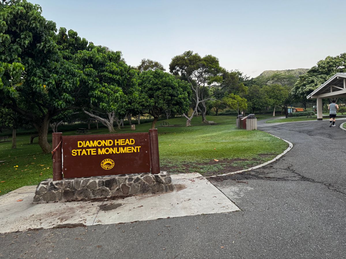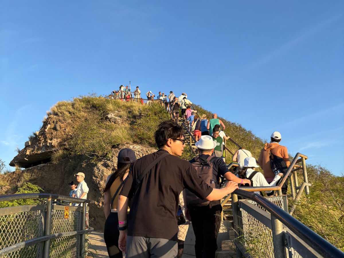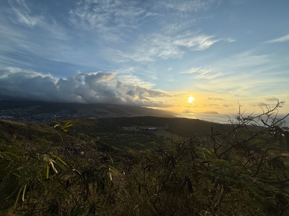 6:10にビジターセンターから登山開始。早朝の爽やかな空気を吸いながら、30分ほどのハイクで頂上に到着。ワイキキビーチを見下ろす絶景を楽しめました。帰りにビジターセンターで記念にステッカーを2枚買いました。