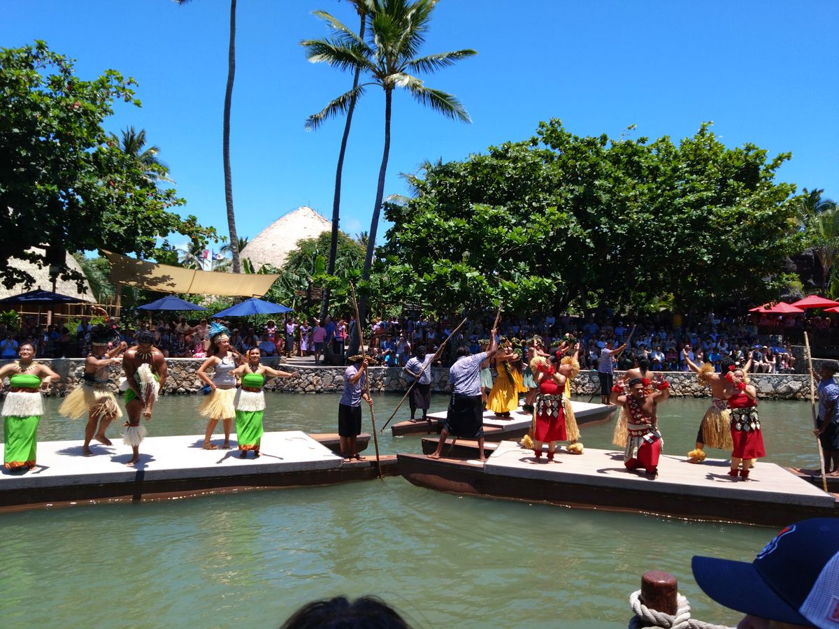 最初にカヌーショーを観たのですが、全員ポリネシアンのダンサーかなと思ってたのですが、このパークの案内やダンサーなど8割はBYUの学生による運営で、カヌーショーのダンサーにも日本人留学生がいたと教えてくれました(全然分からなかった)。入場料は学生の奨学金に充てられるそうで、学費が低く抑えられているそうです。授業は午前中だけで、午後からはスタッフとして働くため、開園が12時半からになっているとのことです。