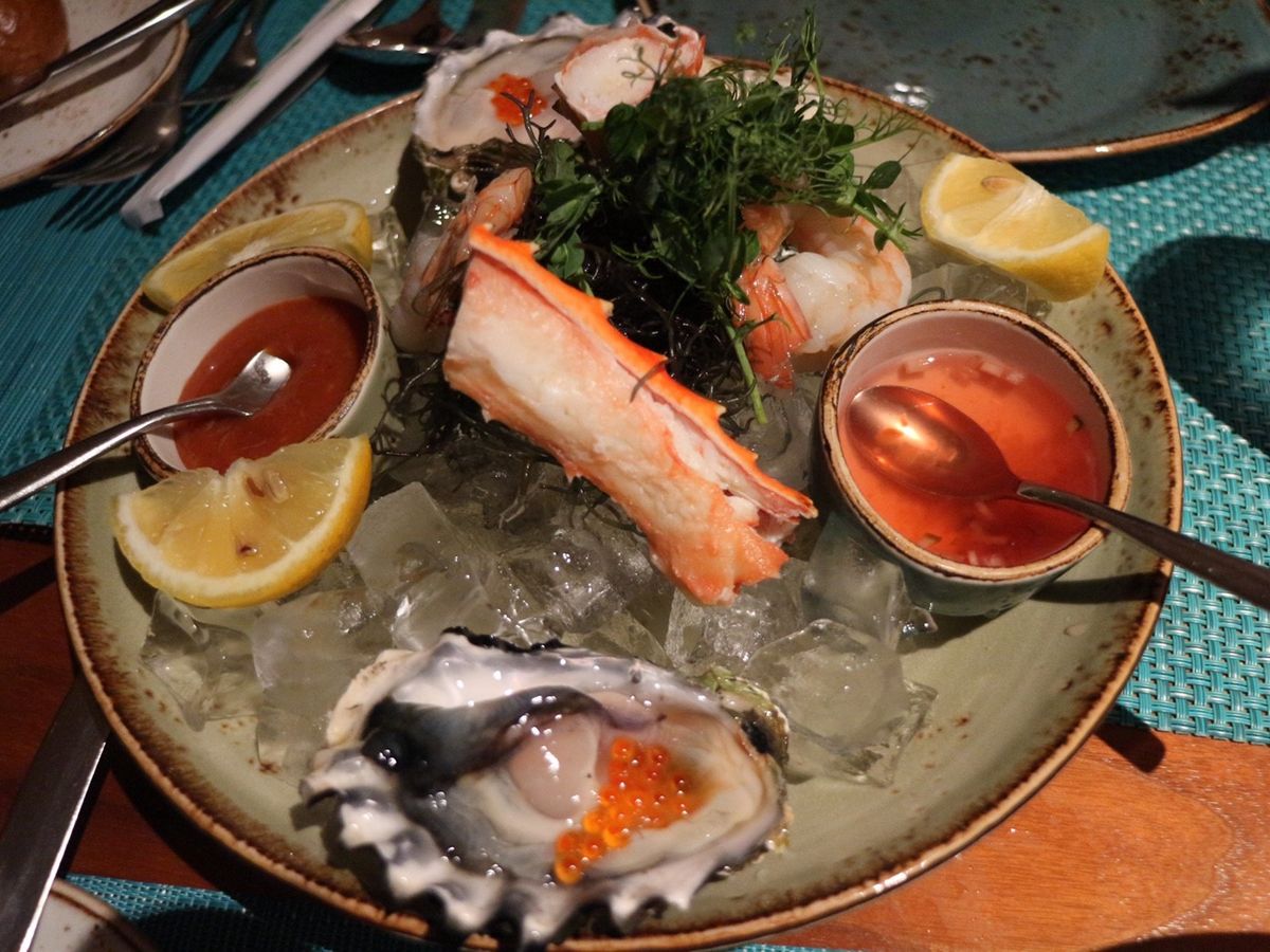 前菜のシーフード盛り合わせに始まり、メインのTボーンステーキ、付け合わせのマッシュポテトにほうれん草にボリューム満点でした。