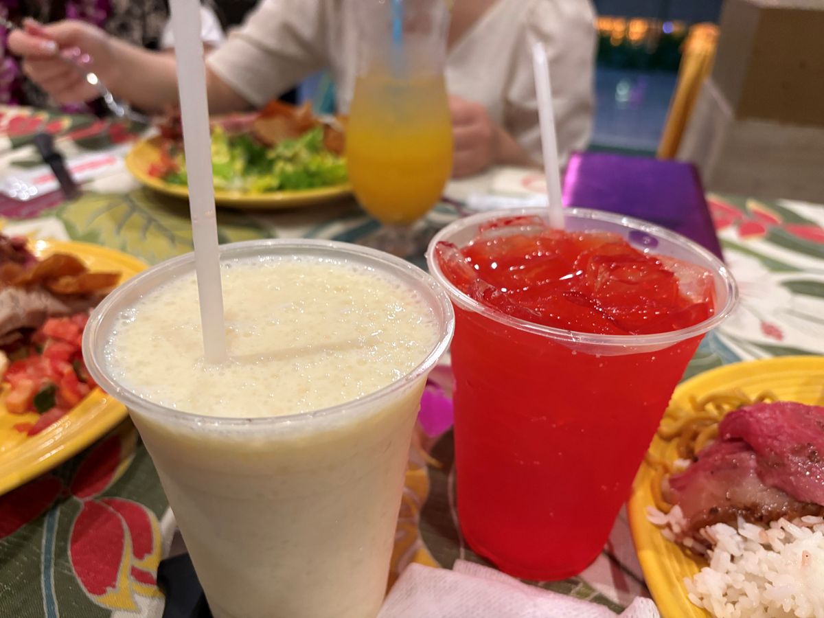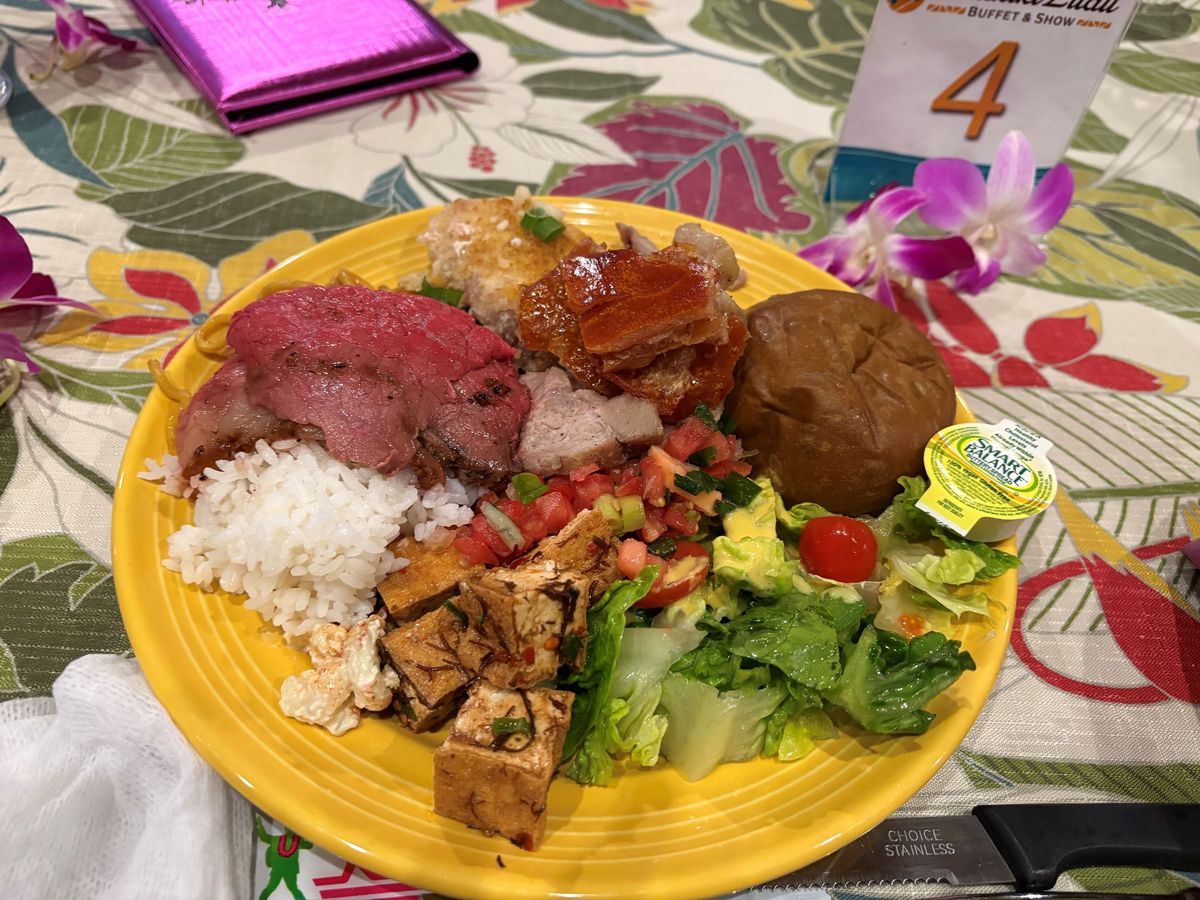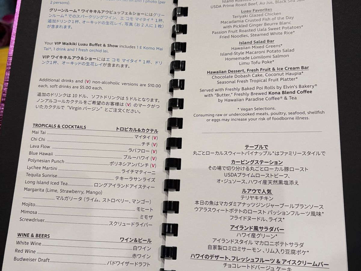 この日の天候が、ロコも驚くような大嵐で、ワイキキの細い道は川のように水が流れ、折れた枝が道に落ちているような中、ロイヤル・ハワイアンセンターではエスカレーターがあちこちでストップし、エレベーターに人が並んでました。そのエレベーター内も雨漏りしておりビュッフェ&ショーが開催されるか心配でしたが、時間が近づくと雨風が弱まり開催されました。生花のレイを首にかけていただき、パイナップルが待つテーブルに案内され、最初のドリンク「マイタイ」のアルコールありか無しかを聞かれます。後でもう1杯ドリンクがもらえるのでメニューをいただき、私たち夫婦は、ココナッツが少し甘い「チチ」(白)とパイナップルやオレンジなど、複数のフルーツが入った「ポリネシアンパンチ」(赤)を、アルコール入りでいただきました。食事はどれも美味しく、子豚の丸焼きは目の前でサイコロ状にさばき、皮が美味しく、追加でいただきました。ローストビーフは生な感じがとても美味しかったです。ショーはロコシンガー・プレスリー(ものまね)・マイケル(ものまね)・ポリネシアンショーとテンポよく進み、私たち夫婦は、英語は理解できませんが楽しかったです。ショーの会場に移るタイミングは、英語のわからない私たちにはわからないので、周りを見て移動しました。バラバラと移動しますが、プランによって会場内のエリアが決まっており、その中では自由席なので、より良い席に座りたい場合は、早めの移動をお勧めします。終了後、マイケルとショーの出演者たちと写真を撮っていただき楽しく帰りました。