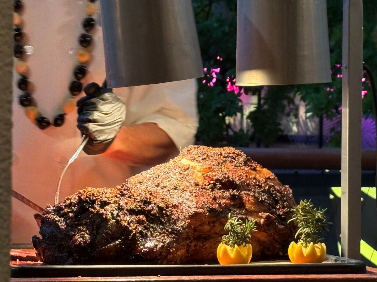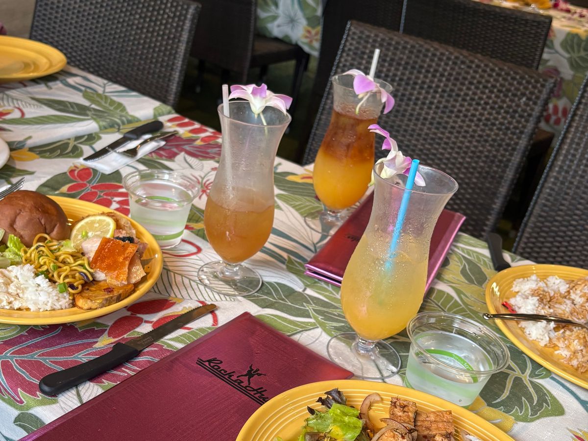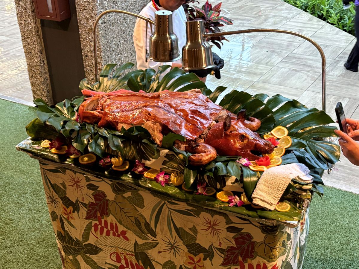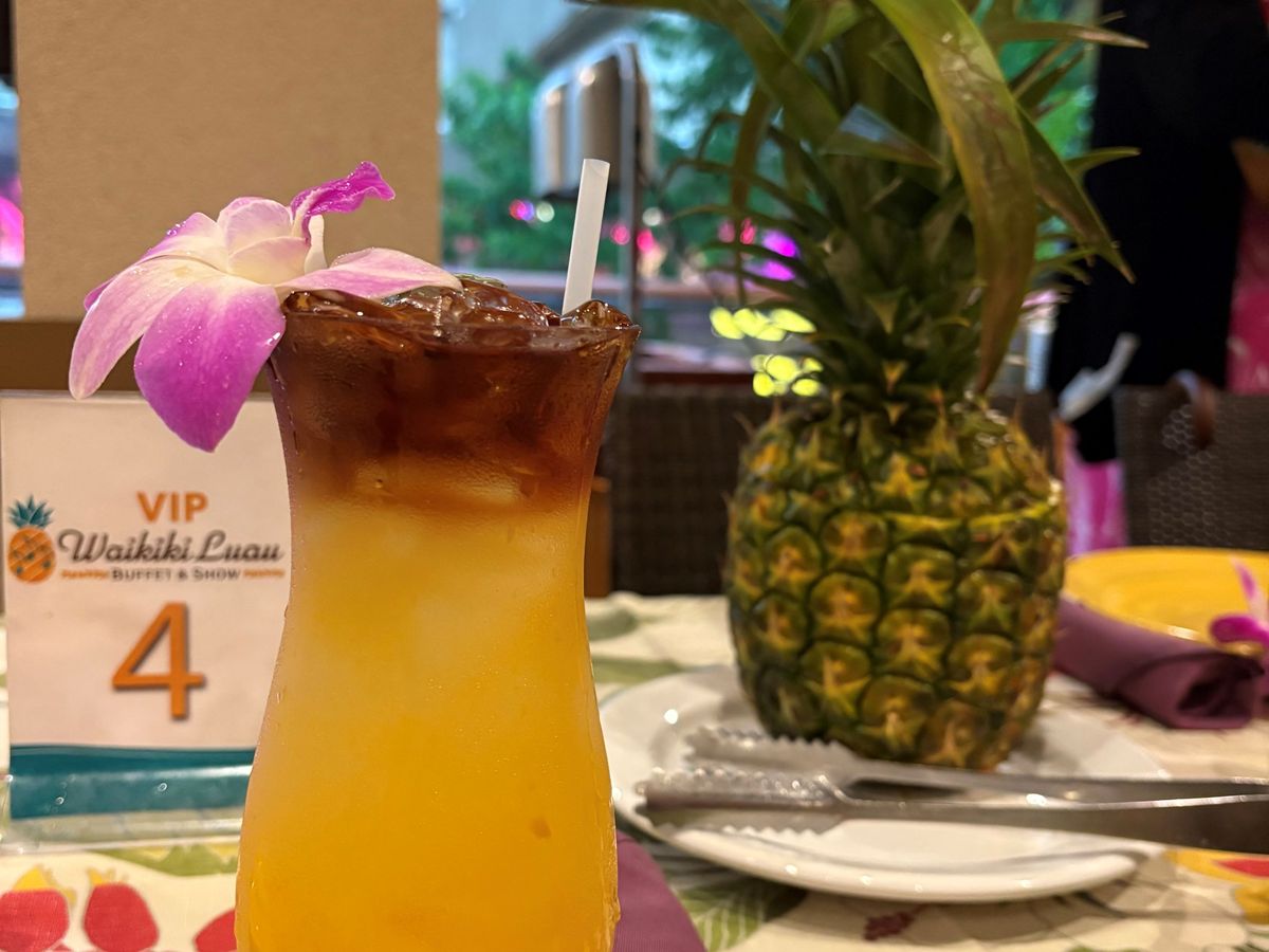 この日の天候が、ロコも驚くような大嵐で、ワイキキの細い道は川のように水が流れ、折れた枝が道に落ちているような中、ロイヤル・ハワイアンセンターではエスカレーターがあちこちでストップし、エレベーターに人が並んでました。そのエレベーター内も雨漏りしておりビュッフェ&ショーが開催されるか心配でしたが、時間が近づくと雨風が弱まり開催されました。生花のレイを首にかけていただき、パイナップルが待つテーブルに案内され、最初のドリンク「マイタイ」のアルコールありか無しかを聞かれます。後でもう1杯ドリンクがもらえるのでメニューをいただき、私たち夫婦は、ココナッツが少し甘い「チチ」(白)とパイナップルやオレンジなど、複数のフルーツが入った「ポリネシアンパンチ」(赤)を、アルコール入りでいただきました。食事はどれも美味しく、子豚の丸焼きは目の前でサイコロ状にさばき、皮が美味しく、追加でいただきました。ローストビーフは生な感じがとても美味しかったです。ショーはロコシンガー・プレスリー(ものまね)・マイケル(ものまね)・ポリネシアンショーとテンポよく進み、私たち夫婦は、英語は理解できませんが楽しかったです。ショーの会場に移るタイミングは、英語のわからない私たちにはわからないので、周りを見て移動しました。バラバラと移動しますが、プランによって会場内のエリアが決まっており、その中では自由席なので、より良い席に座りたい場合は、早めの移動をお勧めします。終了後、マイケルとショーの出演者たちと写真を撮っていただき楽しく帰りました。