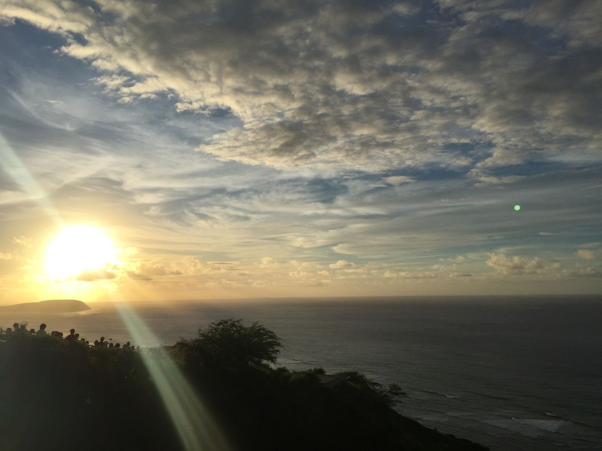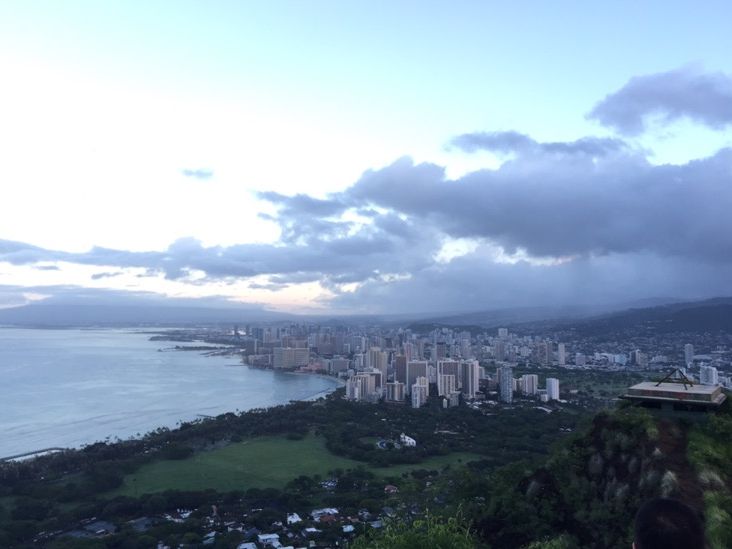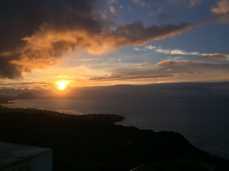 ダイヤモンドヘッドをなめていました!朝暗いうちに出発し、6時開門まで説明を聞き、眠い目をこすりながら暗い夜空が明けて行くのを待っていました。標高260メートルとのこと楽勝だなと考えながら登頂開始。以外に早いペースで皆さん歩いていましたが、だんだん狭く階段になってくると急にペースダウン。最後の階段ではかなりバテました。ただ、頂上からの景色と朝日が抜群で本当の意味でのダイヤモンドヘッドを知った感じです。見慣れたダイヤモンドヘッドをハワイ6回目で初めて登り、楽しさを痛感しました。2日目に登ったので、その日からご想像通り筋肉痛でたいへんでしたが…。