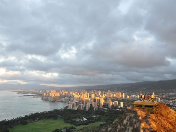 当日、あいにくの天気で水平線から登る旭は雲で見えませんでしたが、ワイキキの街並みが綺麗にみえました。