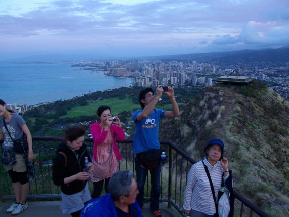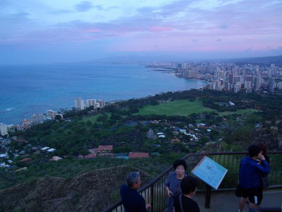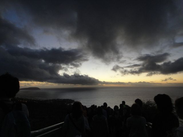 頂上付近の狭い階段はひとが多くてなかなか進めませんでしたが、頂上まで登って日の出の写真を撮りました。反対側にワイキキの街が見下ろせこちらのほうも見応えがありました。