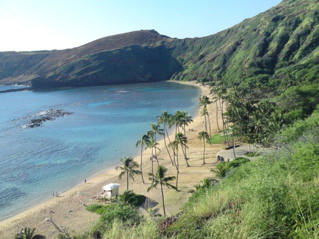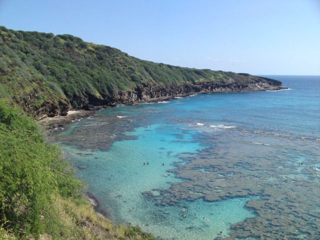 ハナウマ湾入り口で$7.5支払い、シアターでハナウマ湾の歴史(英語)を見せられ、5~10分程の距離の坂を下ってビーチに到着。