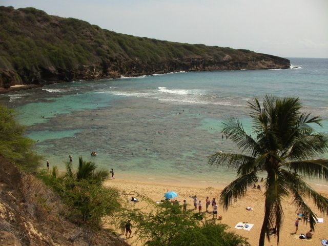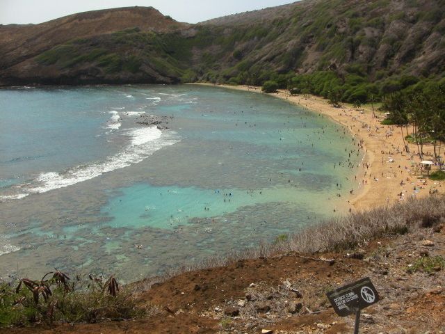 雲が多めですっきり日の出を見ることは出来なかったが、何度きても頂上からの眺めは最高です。途中真っ暗だった階段は照明がついて懐中電灯はいらなくなりました、真っ暗の方がおもしろかったのに残念。ドライブインでミニ?ロコモコの朝食は男性ではちょっと量が少なすぎるかな。ハナウマ湾は2回目、入り口付近はずいぶん立派になりました。入り口坂の上にあるトイレ横にある売店では飲み物軽食があります。トイレはビーチにもあり着替えもできます。シャワーもあり不自由しません。シュノーケルで波打ち際を海中見るだけで色とりどりの魚がいっぱい泳いでいて感激します、まるで水族館の水槽の中を泳いでいるようといったら言い過ぎかな?とにかくきれいなビーチです。