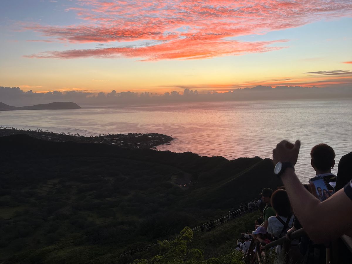 ダイヤモンドヘッドは、1月上旬で6時過ぎからハイキングスタートでした。かなりのハイペースで登った為、夜景も見ることが出来ました。朝日は残念ながら曇って見られませんでした。朝日が登る時間まで頂上にいると、バス出発時間には間に合いません。もう1本後のスタート時間にすればよかったかなと思いました。