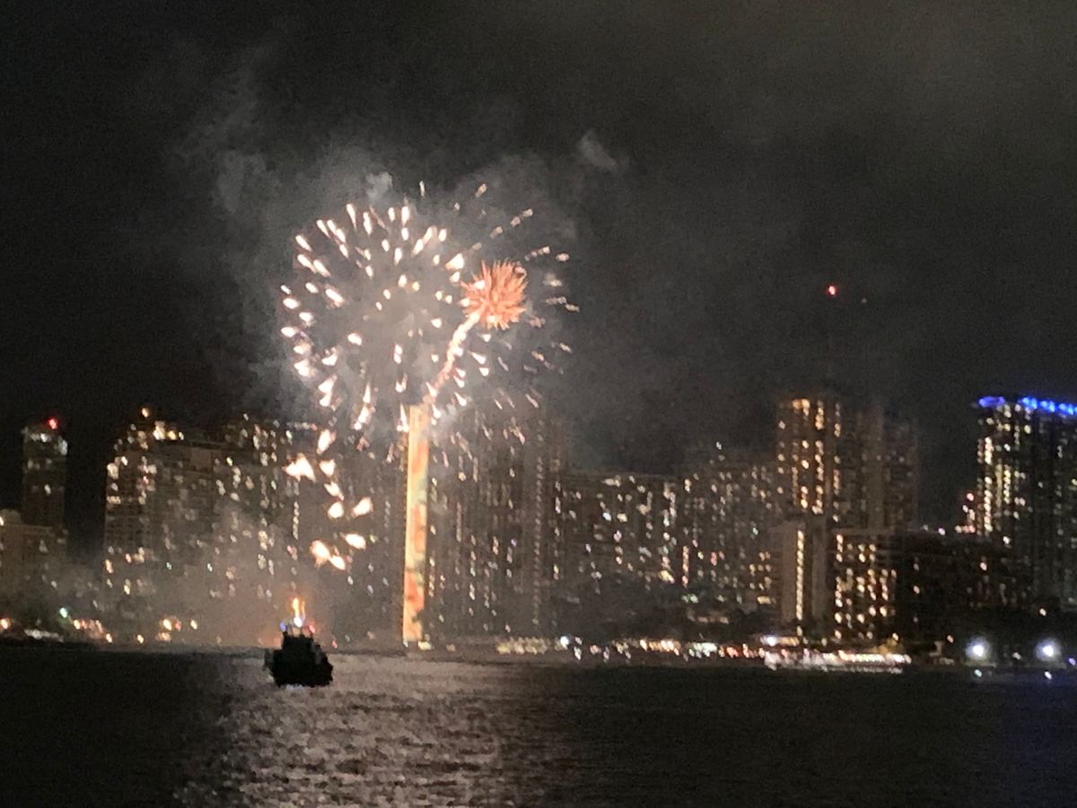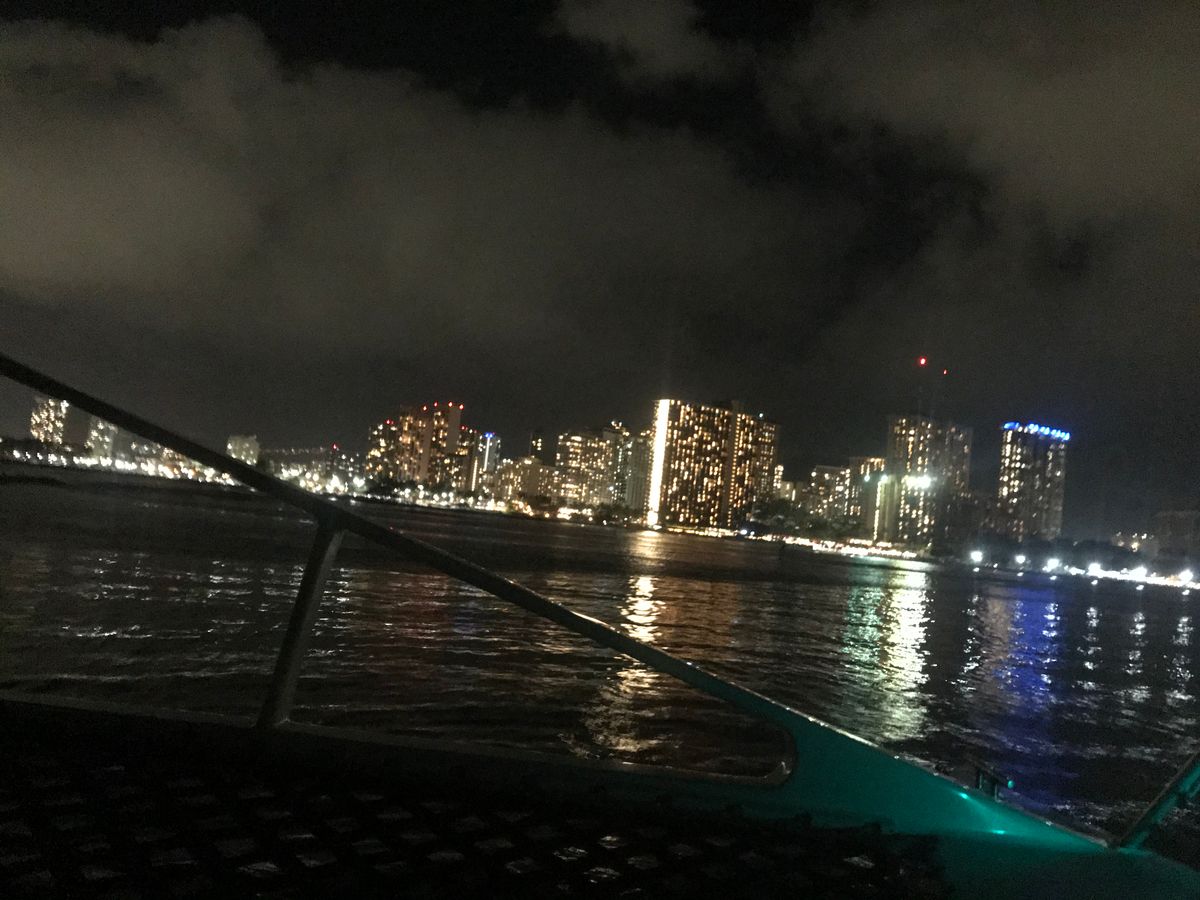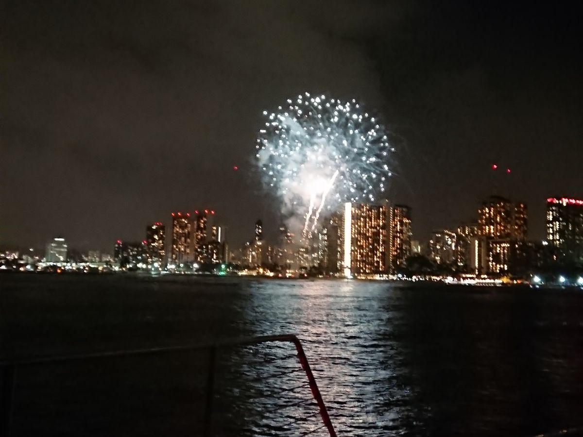 船上からみるワイキキ、花火は初めてでしたが、風も気持ちよくとても良い思い出になりました。