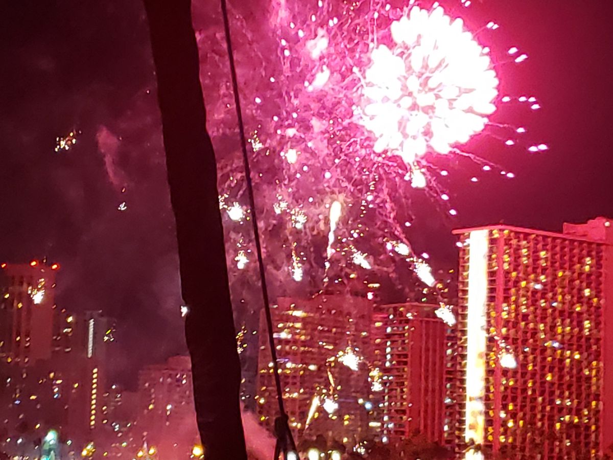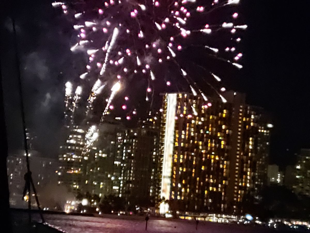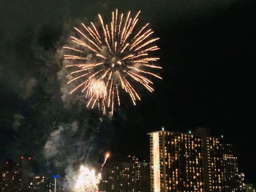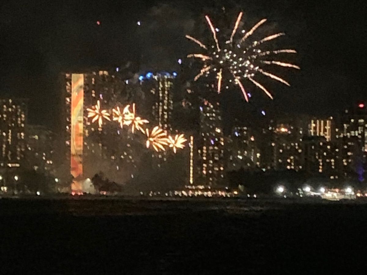 船上からみるワイキキ、花火は初めてでしたが、風も気持ちよくとても良い思い出になりました。