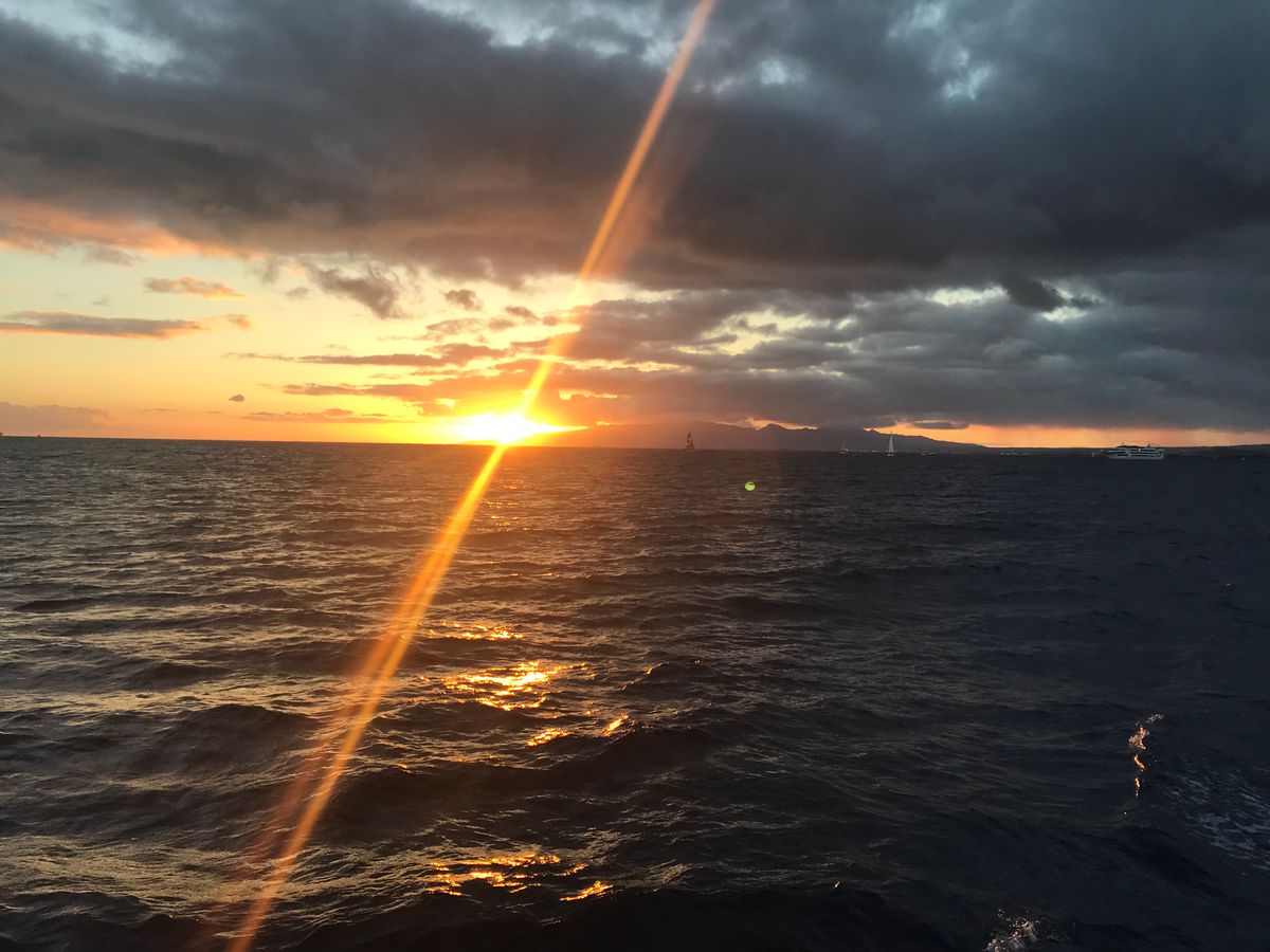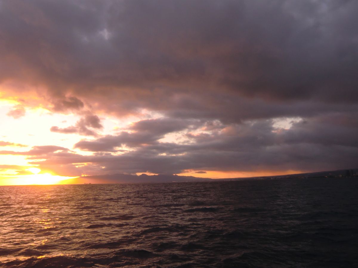 サンセットクルーズなので夕暮れのダイヤモンドヘッドやワイキキの街並みを海側から見れてロマンチック。船も帆を立てるのでエンジン音もなく、スムーズに海を漂い、夜の花火へ