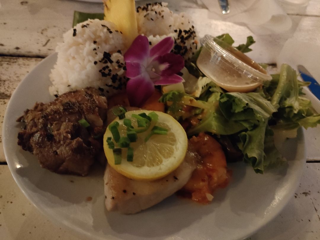ステーキ・フィッシュソテー・ガーリックシュリンプの1プレートで美味しく、非常に食べ応えがありました。