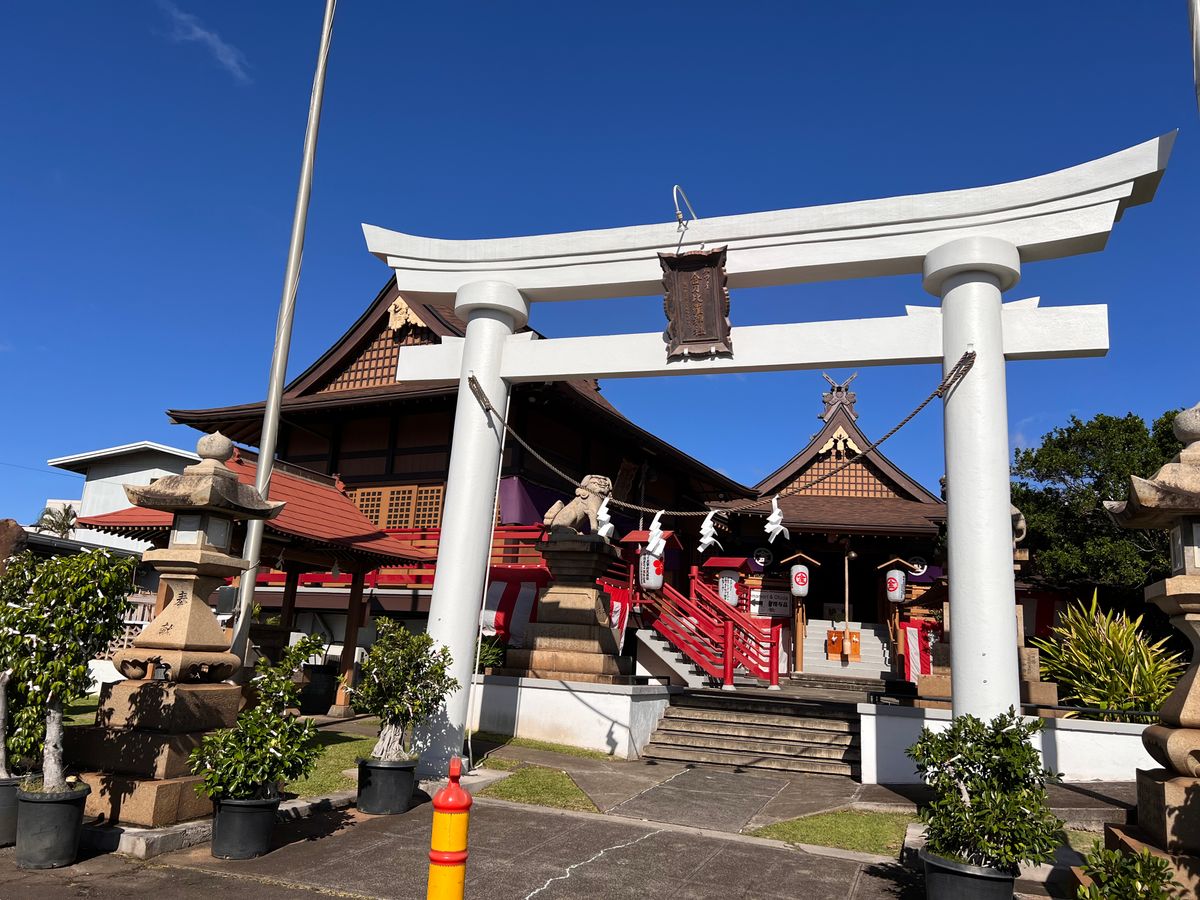 11時ごろにはお店が閉まりだすとのことで、出雲大社は後回しにして気を使っていただきました。最近はKKCのマーケットよりこちらの方が賑やかとのこと。1時間ぐらいでまわり、出雲大社へ。治安が悪くなったからか、鍵がかかっており社務所に入る人数制限があったり、以前の様なフレンドリーさは全くなし。(神社なので本来はそうですが・・・)お参りをしてさっさと車にもどりました。最後の経由地はカカアコのHマーケット内にある落書きだらけのバンのガーリックシュリンプで有名なジョバンニ3号店へ。カカアコ散策したい場合は持ち帰りができる様ですが、ウォールアートを見るための時間はあまりないので全員食事へ。食後はワイキキへと戻る短時間でオアフ島南部周辺を効率よく回れるツアーです。