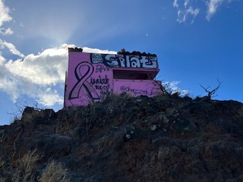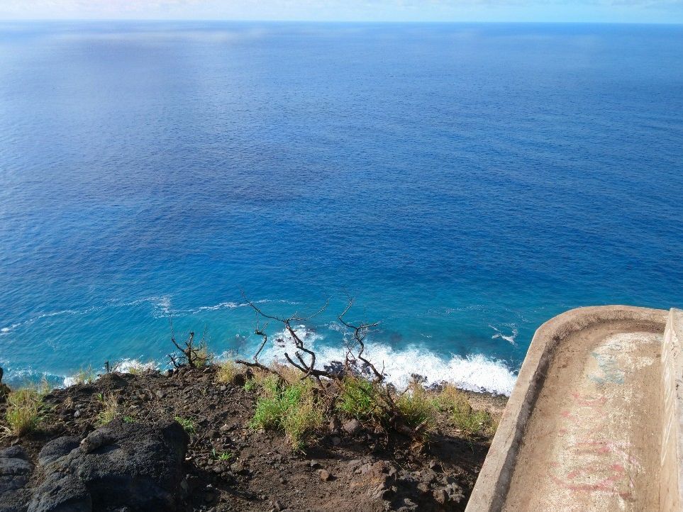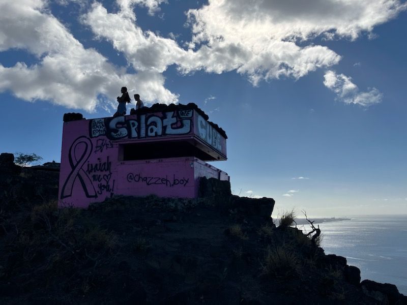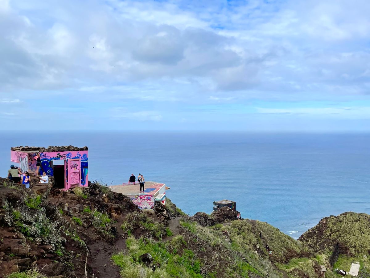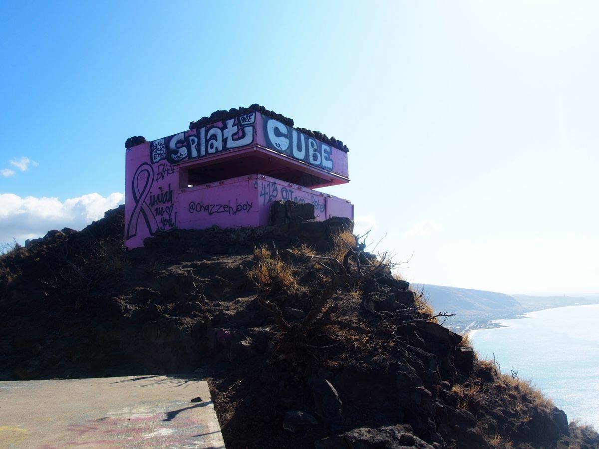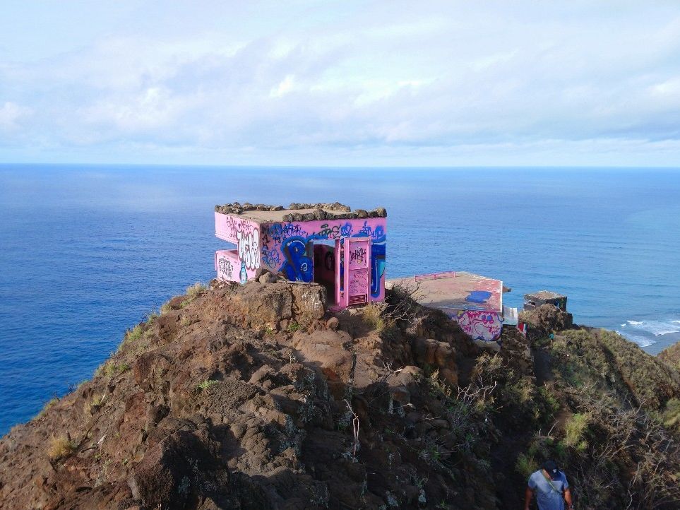 「え、ここ登るの?」というような登山口。とてもトレッキングとは思えない(汗。でも絶景が広がると聞かされ”登山”開始。ちょっと岩がゴロゴロしているもののスニーカーで行ける山道を進めば眼下はすでに絶景。登っていくとはるか彼方の頂上に「ピンクの建物」。さらに気合を入れて約40分で目的地に着きました。ピンクピルボックスは5-6m四方の箱でかわいい感じですが登山者の落書きが少し残念。でもそこから見える景色は、街、海岸、海原すべて美しく、まさに絶景でした。途中多くの下山者とすれ違いましたが、皆さん直射日光が登山道にあたらない時間に登って下山しているようでした。11時までに下山できるくらいでしょうか。