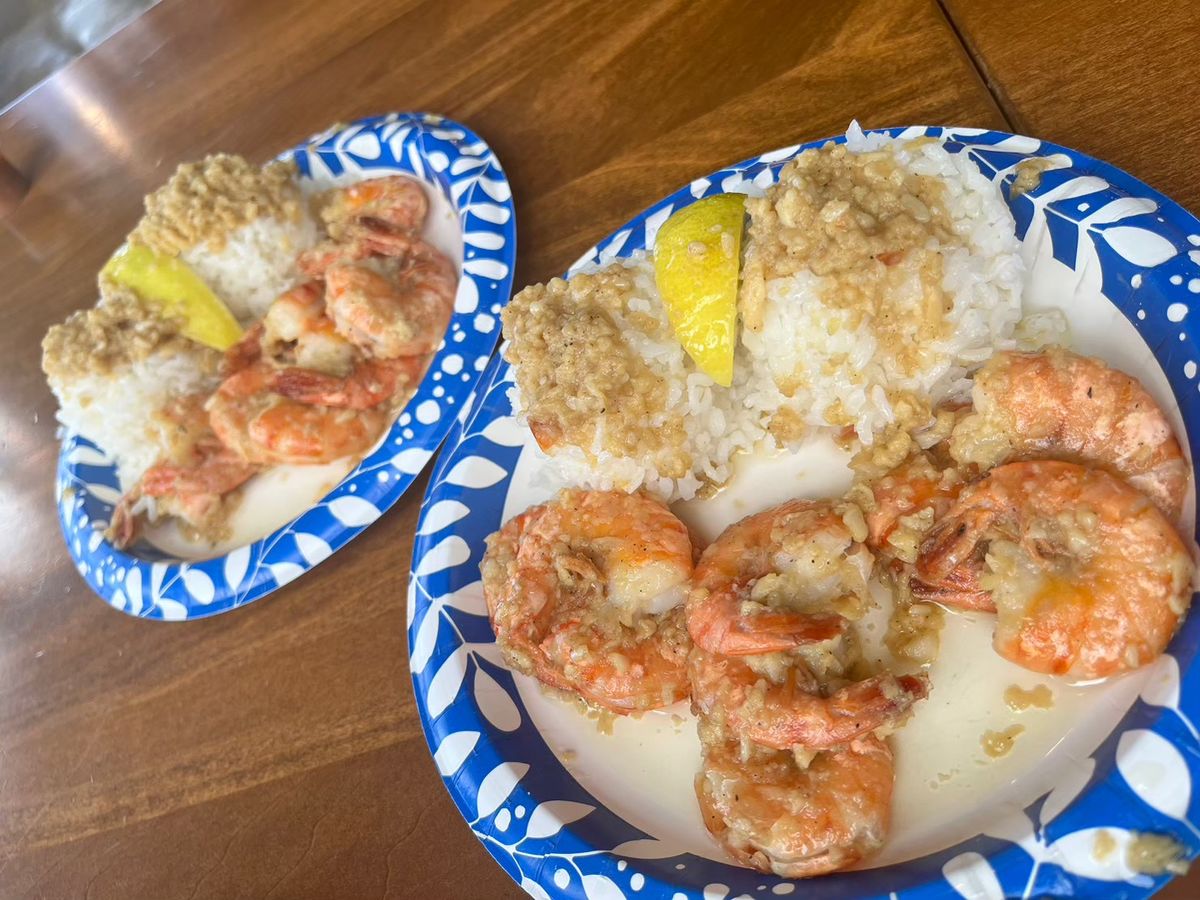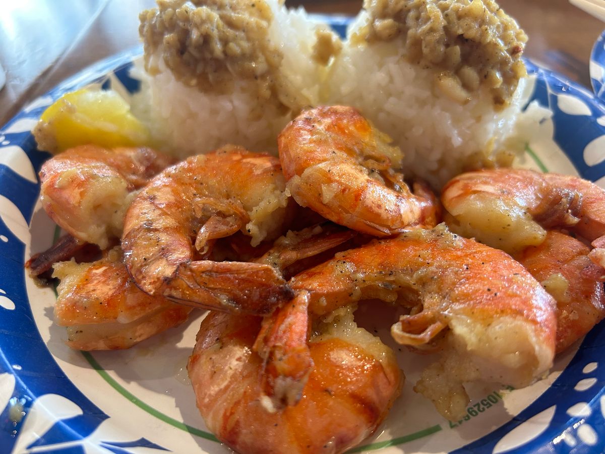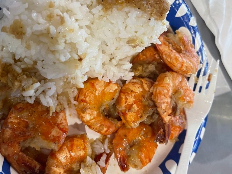 朝一でもペロリですお昼はガーリックシュリンプ‥これはちゃんと一人前あります。マラサダを食べたり、けっこう満腹になるツアーでした。