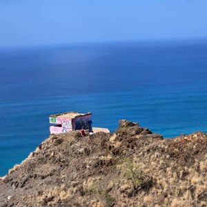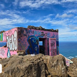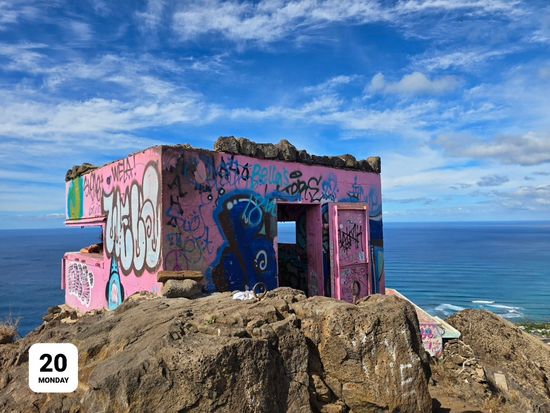 その後とうとうピンクピルボックスの頭頂口に到着。晴天26度。レビューである程度覚悟してたけどそれ以上の本格登山でした。片道40分休憩10分合計90分、上りも下りも大変と事前に説明いただきました。完全デスクワーク・運動歴ゼロ・超インドア派・アラカン・ぽっちゃり体型の私、舗装していないことは事前に理解してましたが、滑るわ、岩大きい、等間隔じゃないし、勾配大だし。休憩しながらマイペースで無事登頂でき、最高の景色を見ることができました。