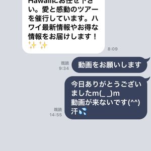 先日は弊社ツアーにご参加頂きまして誠にありがとうございました。担当ガイドの手違いで公式LINEのデータ送信が遅くなりまして申し訳ありませんでした。すでに写真等をお送りしておりますのでよろしくお願いします。今後はこの様なことがない様にその日のうちに送信完了する様に徹底しておりますのでご安心下さい。それではどうぞよろしくお願い致します。Hoihoi Hawaii