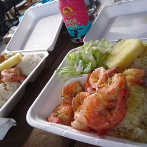 ノーマルのガーリックシュリンプとレモペッパー味を一つづつ頼んで半分こして食べました。エビは8匹入ってましたよ! ビールはハレイワで買って持ち込みをしました。