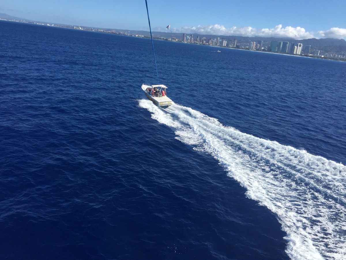 パラセイリング初体験です。90Mとはどんなものかも想像つきませんでしたが、絶叫マシンが苦手な私でも大丈夫。クルーザーから一気に空へと上がります。空からはワイキキの街全体が見られてとても気持ちがよかったです。スタッフは現地の方でしたが、単語日本語を話してくれるので問題ないです