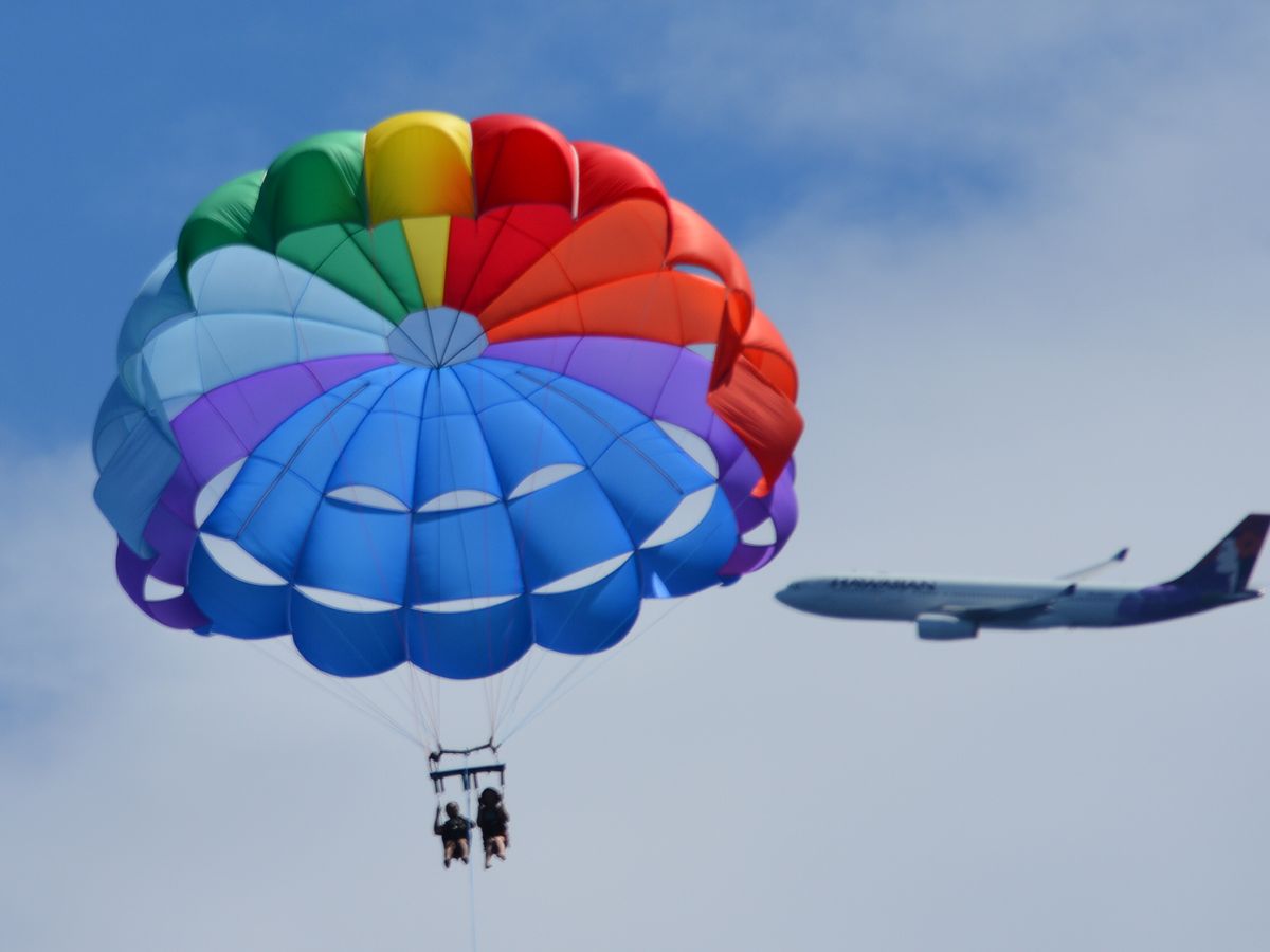 インストラクターの兄さんは英語のみしかはなせませんでしたが、パラセイルの作りが簡単なのかあまり高度な英語は必要ありませんでした。Q.手はどこを持つのか?→「バンドを握って、フックは触らないでね」Q.座り方はどうするのか?→「ふかく腰掛けてね。コマネチ状態はだめ〜」など、教えてくれました!!カンタンでした!!ワイキキの海から見下ろすダイヤモンドヘッドやホテルたちは圧巻。とても良い経験でした。ビデオカメラをセルフィー棒につけて飛んでいた人もいました。固定用のバンドがあるみたいです。