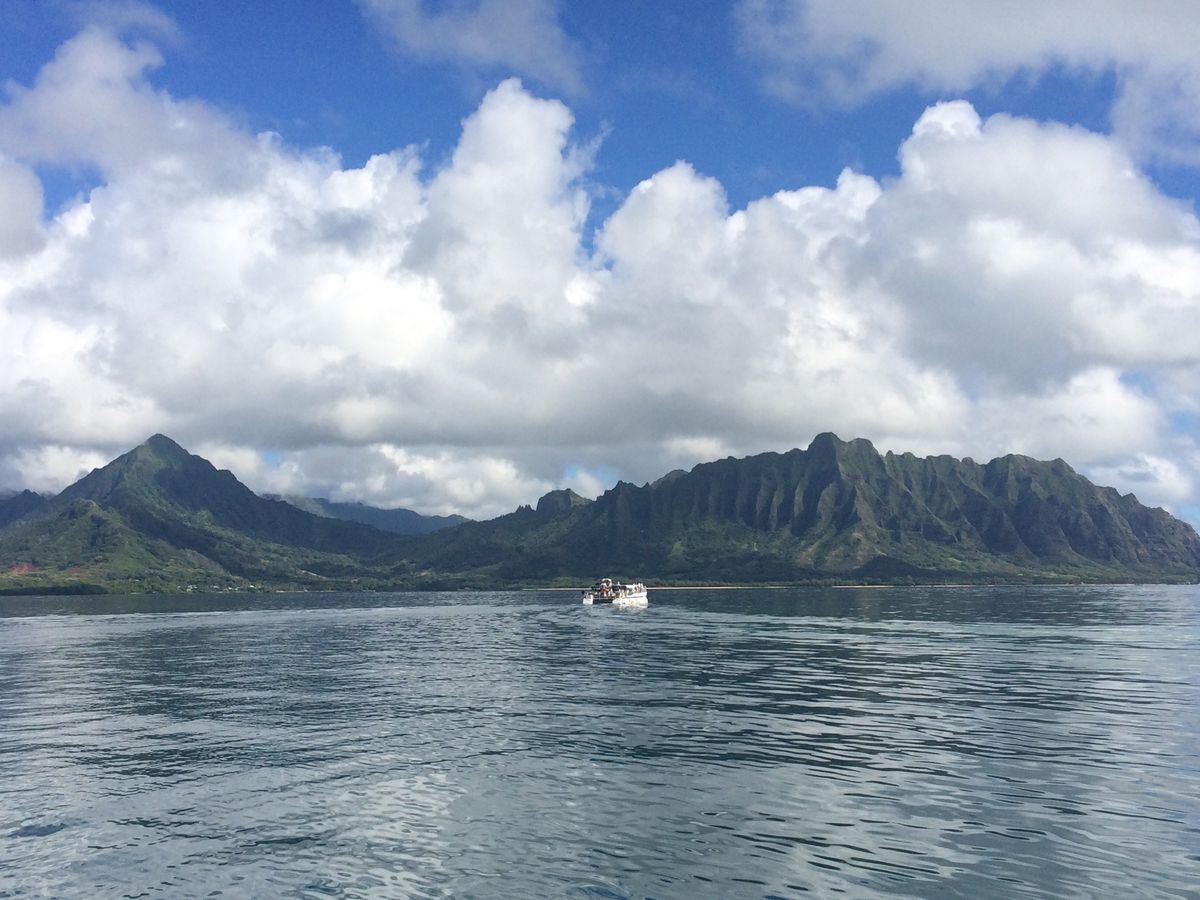 ボートから映画の撮影に良く使われる山並みを眺めながら、カネオヘ湾の海亀スポットへ。この日は「風が弱く海が澄んでいる」とガイドのお姉さんが言っていましたが、本当に海が透明で珊瑚礁と海亀が凄く綺麗に見れました。海亀はいっぱい現れましたよ。