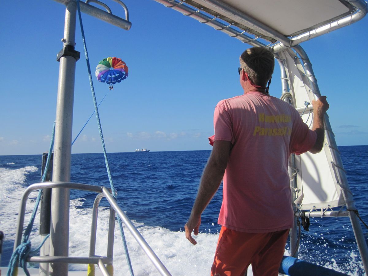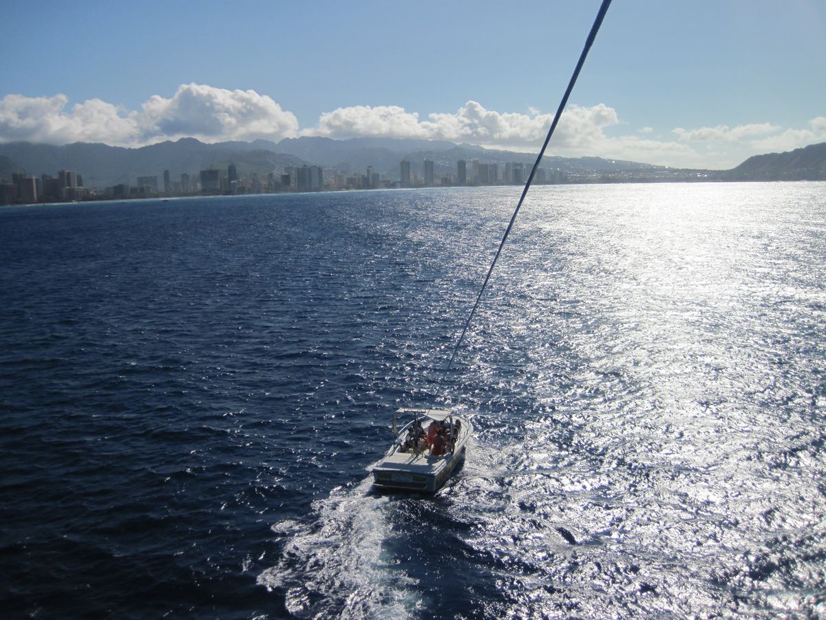 ロープの長さが違うためか、我々夫婦は最終組に。ボートの後ろに二人横並びで座り、パラシュートに接続される。ボートがエンジンを吹かし、いざ、空中へ。 ロープか繰り出される。ロープが繰り出されている間は、海面近くを浮いている。ロープの繰り出しが終わるとスーッと上昇。恐怖感は全くなし。上空からの眺めはもう最高! ワイキキビーチ沿いのホテル群はもちろん、ダイヤモンドヘッドや遠くの山々までもが眼下に広がっている感じ。ボートが白波をあげて走っている。風は心地よく、静寂な(実際にはボートの音が聞こえてますが)ひととき。ズ〜っとこのままでいたい。妻は、パラシュートの色がカラフルだと喜んでいる(ナンノコッチャ)。 しばらくすると体に軽い衝撃が。どうやらロープが巻き取られ始めたらしい。だんだんボートが近づき、お決まりの海ポチャ。ボートから女の子達の歓声が湧く。再び、少し上昇。ロープが巻き取られ、二人は、ボートの後ろに着地。パラシュートを外してもらい、ボートの中へ。女の子達とハイタッチ。不安がっていた自分がバカバカしくなった。