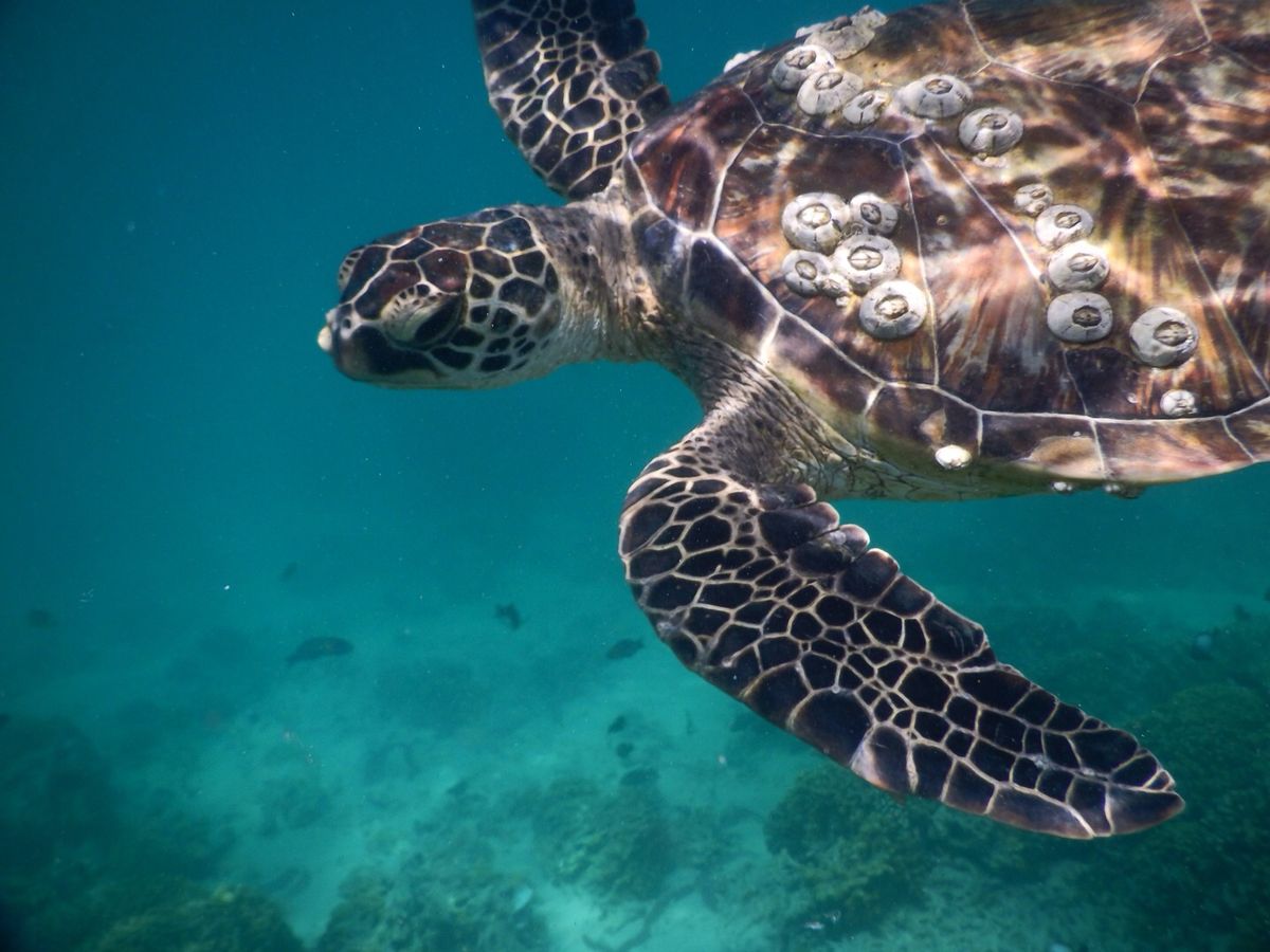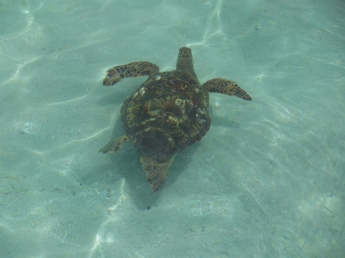 ウミガメウオッチングでは5匹見ることが出来ましたが離れているため、珍しいウミガメ見ることが出来たラッキー。まあこんなもんかなと思いました。サンドバーでのビーチバレーや写真撮影で楽しんだ後、シュノーケリングの準備のためボートに戻ったとたんウミガメの接近、ウミガメの方から近づいてきた?。数センチの距離でタッチ出来るので触ろうとしましたがクルーからウミガメは保護されているため触っちゃだめとのこと。あまりにも近距離での遭遇に感激。シュノーケリングでは珊瑚礁と海底の境界に沿って往復30分程度でしたがきれいな魚をたくさん見ることが出来、珊瑚礁の中でウミガメがやすんでいるところも見ることが出来て感激でした。シュノーケリングが終わりボートまで近づいたらたらまたウミガメがタッチ出来る距離まで3匹近づいて来たので慌てて潜り目の前で見ることが出来ました。ウミガメは人を怖がらない、ウミガメが人を見に来た?・・・そんな感じ。同じボートに乗った人がウミガメに足をかまれました。小さな傷でしたがクルーがすぐ手当てしてくれよかったです。サンドバーに降りる前、ウミガメが近づいて来たら、指を出して振るとウミガメがえさと勘違してかまれるとの注意がありましたがそのときはひょうきんなクルーの話で冗談と思いましたがまさかの事態。クルーの方もとてもユーモラスでまた同じクルーのツアーに参加できたらと思います。楽しい時をありがとうございました。